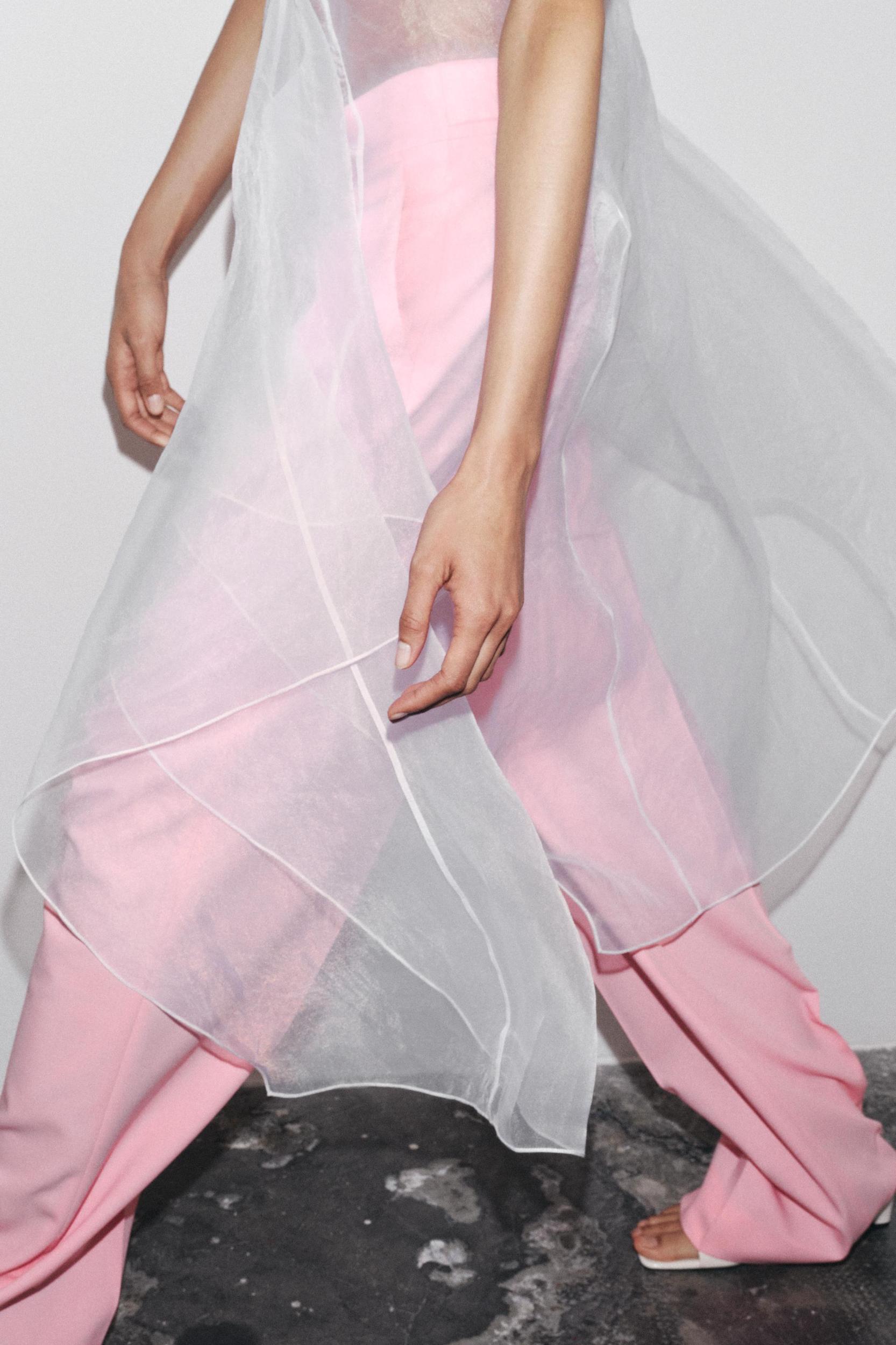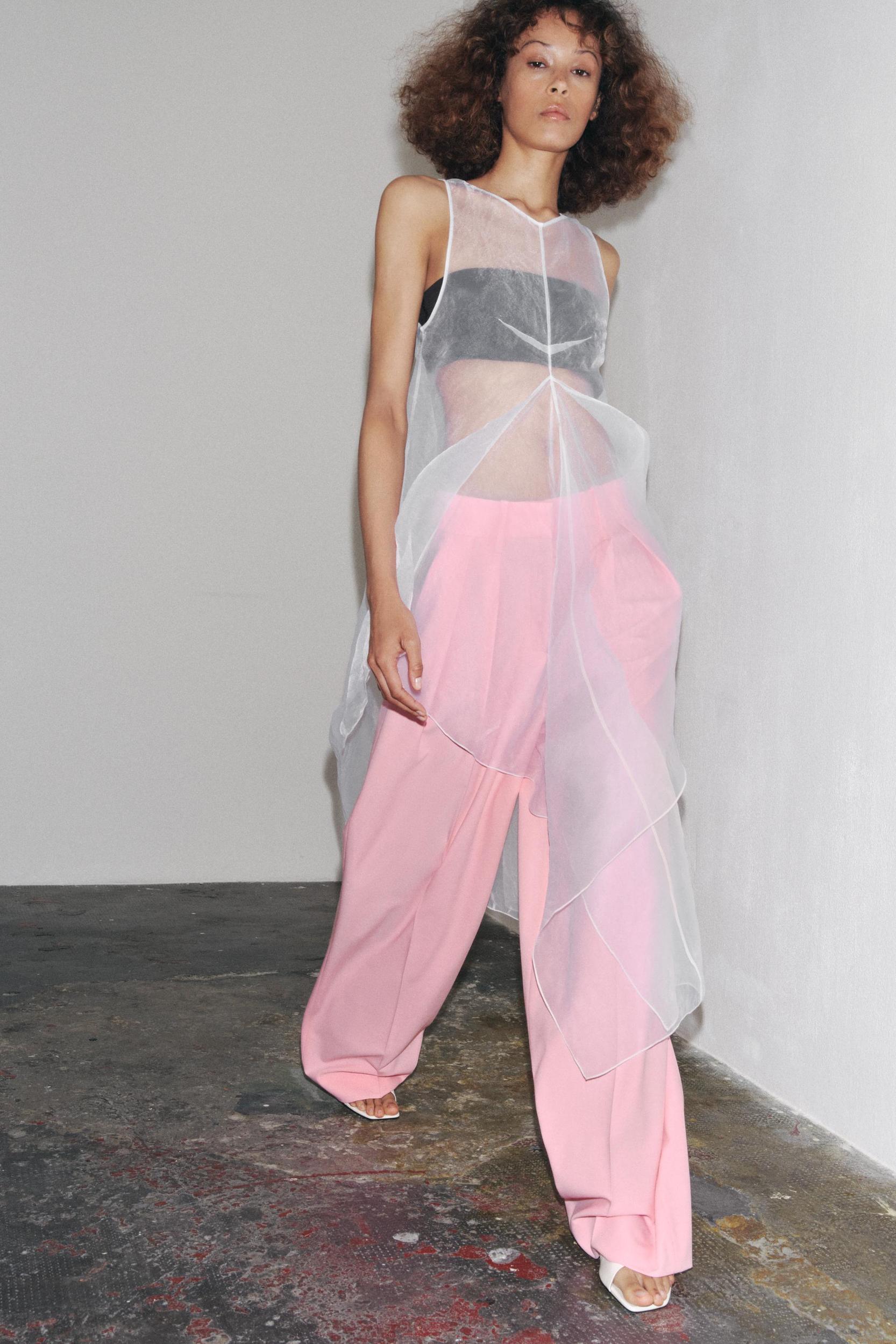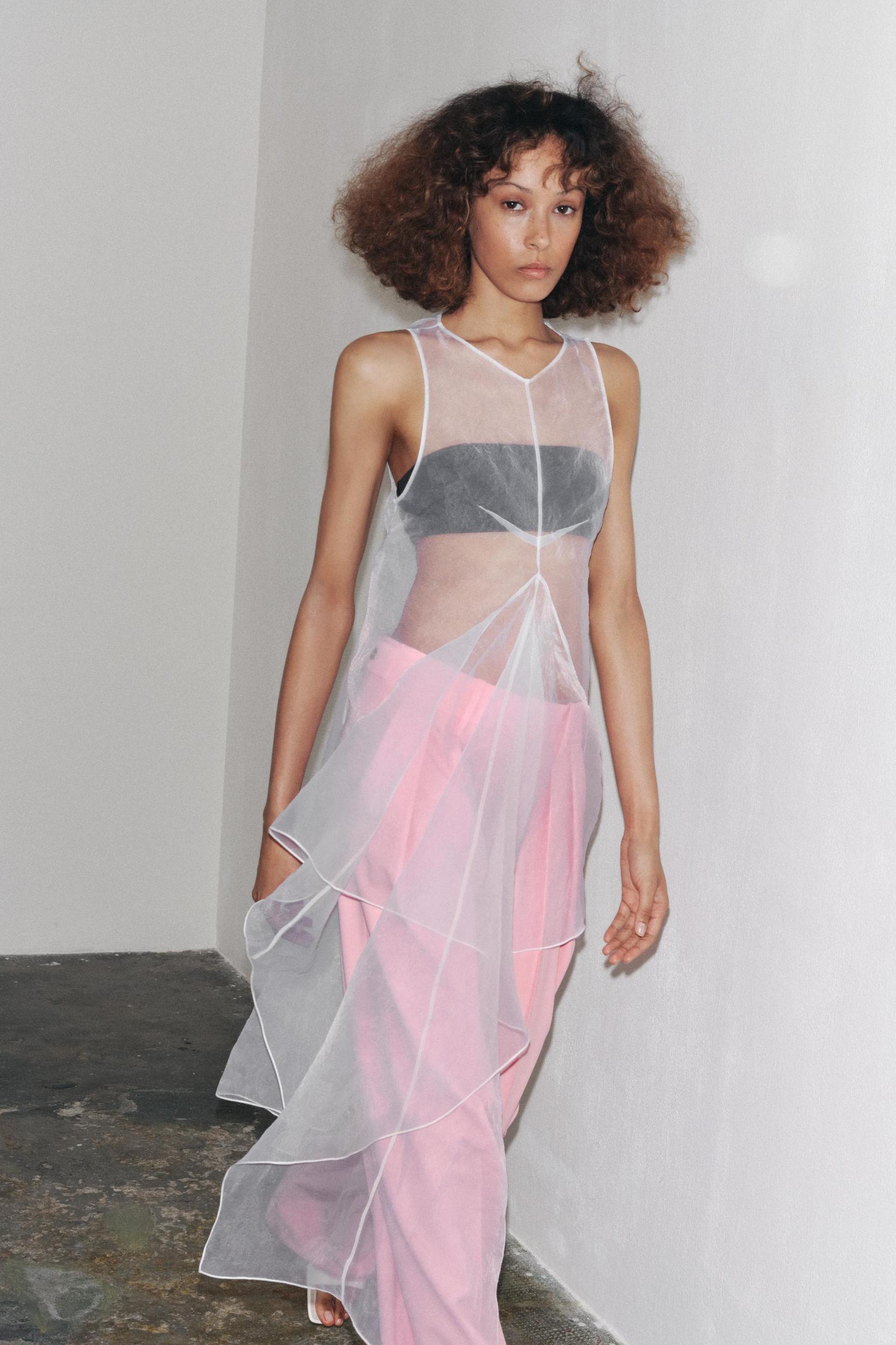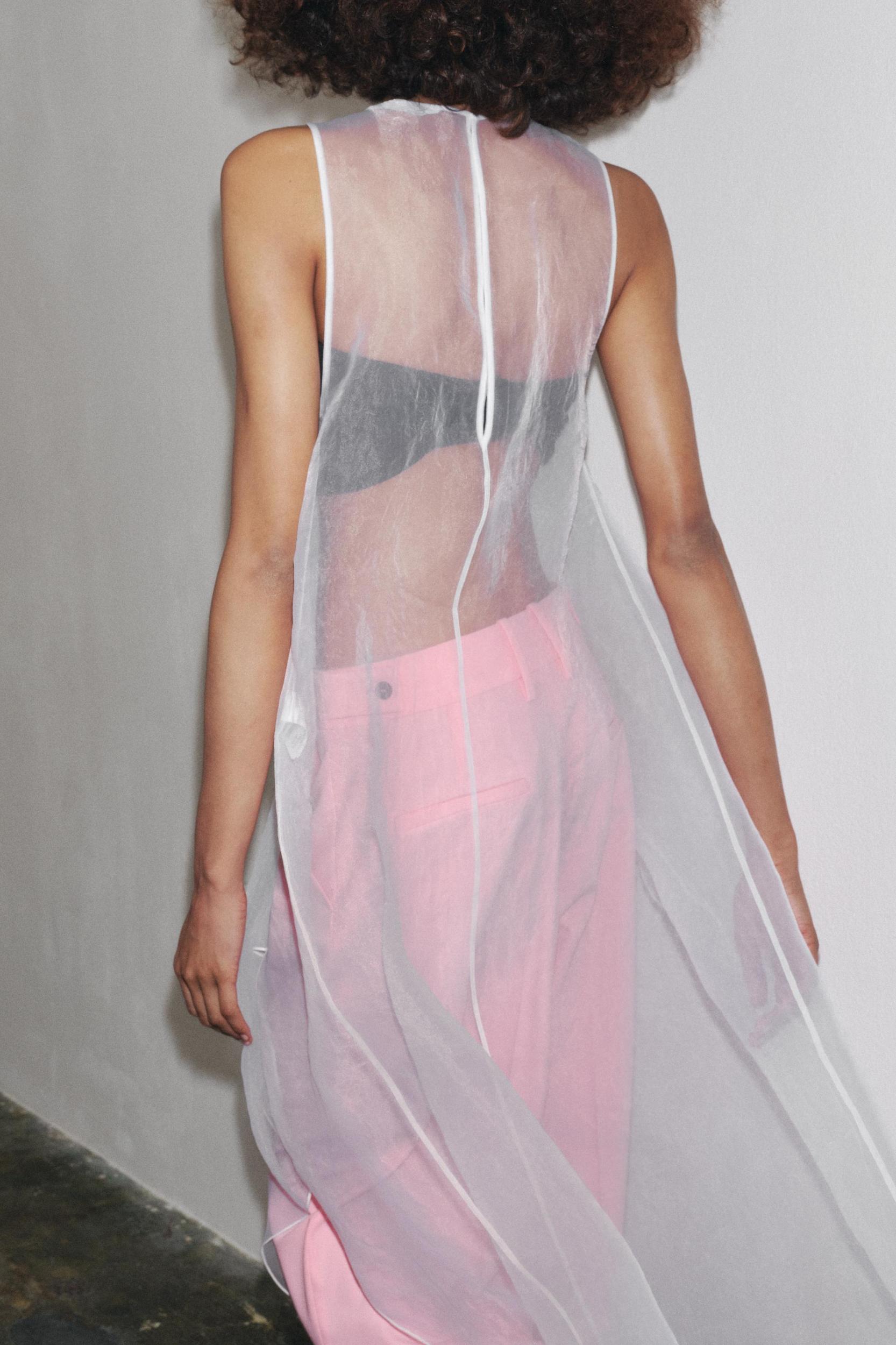 ZARA WOMAN COLLECTION Semi-sheer dress made of organza-like fabric. Round neck and sleeveless. Fabric detail with volume on the front. Asymmetric hem. Back closure with opening and button.