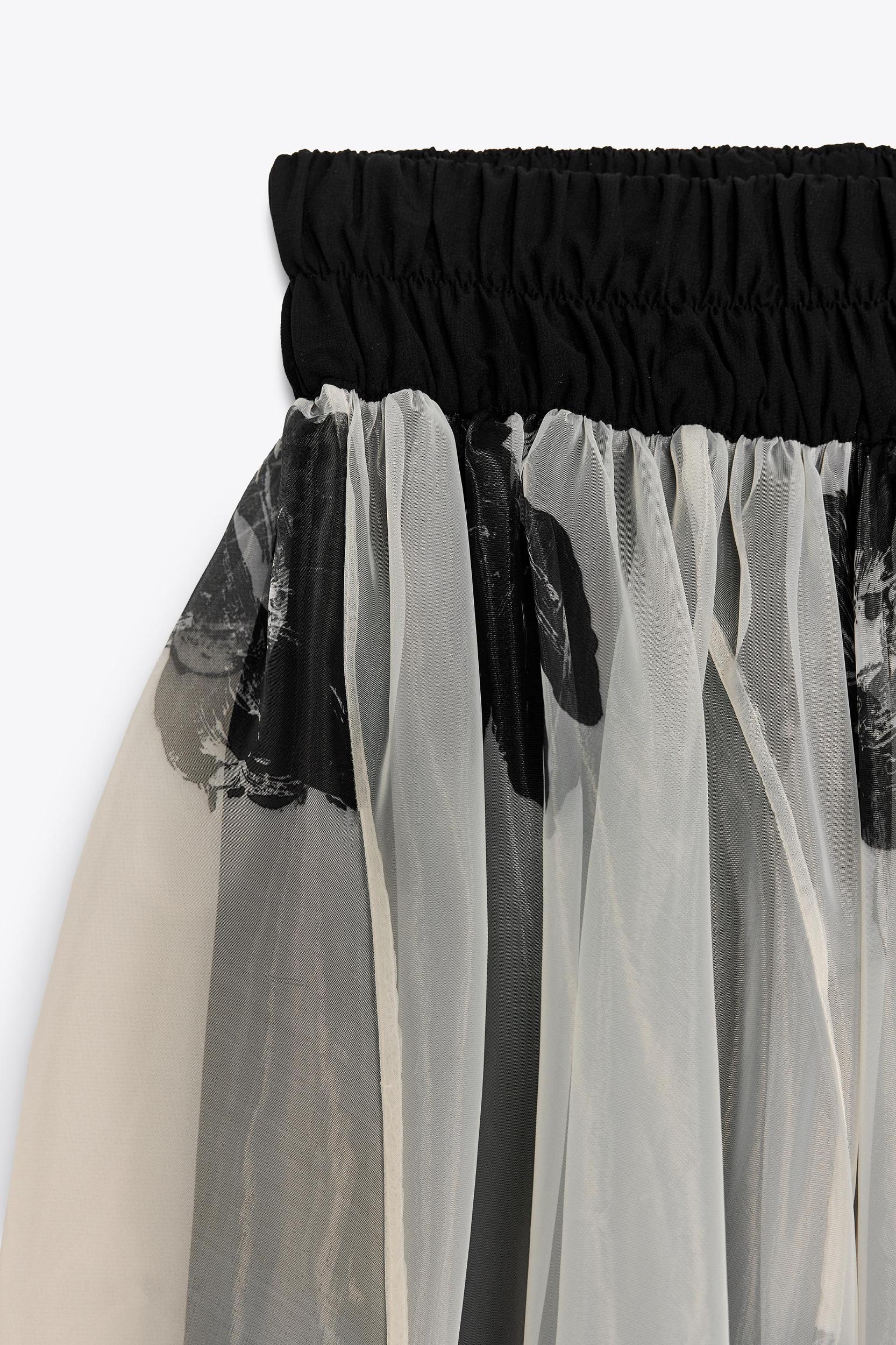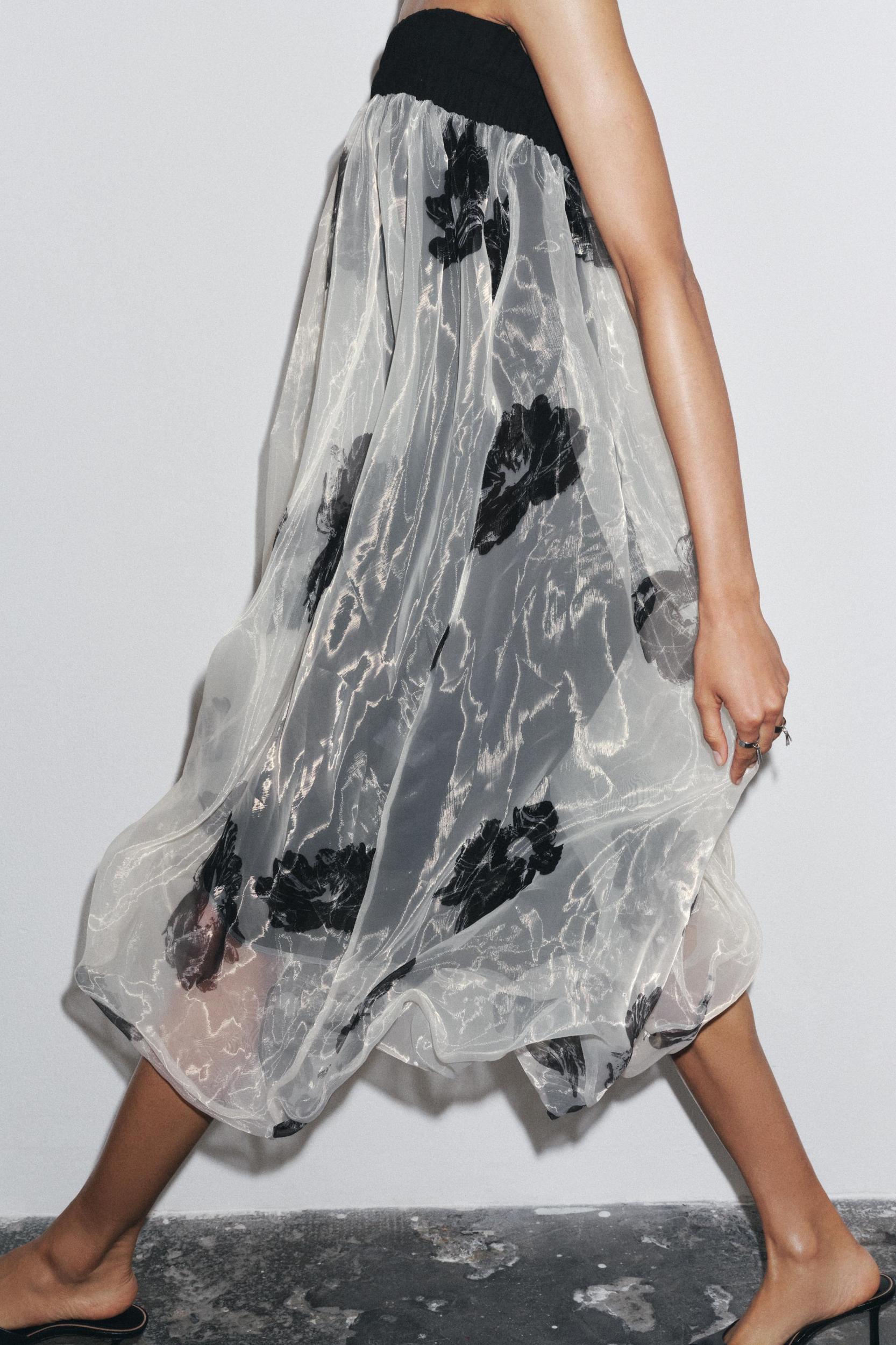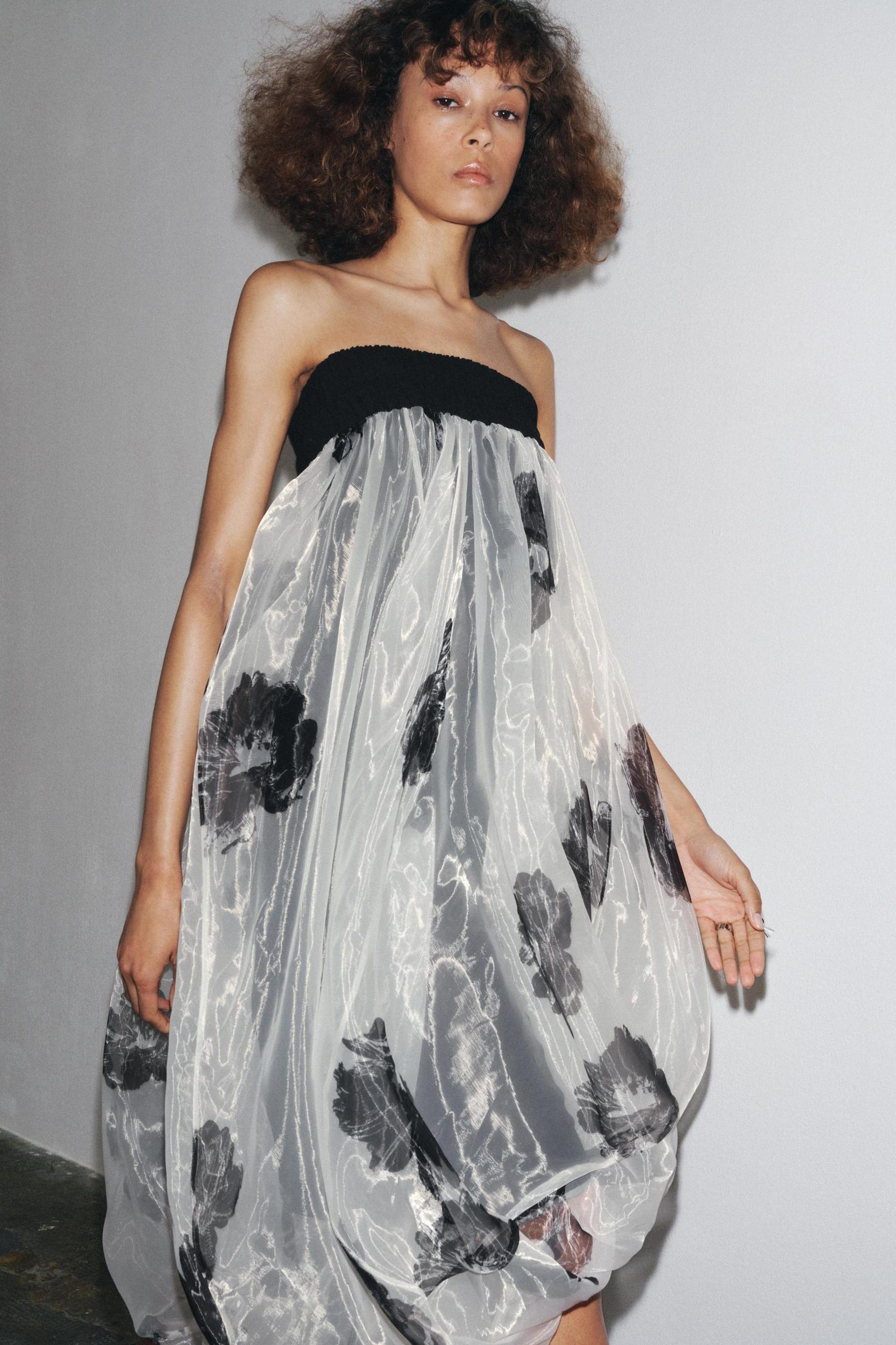 ZARA WOMAN COLLECTION Dress made in organza-like fabric. Strapless design with contrasting elastic. Contrasting floral print. Balloon hem.