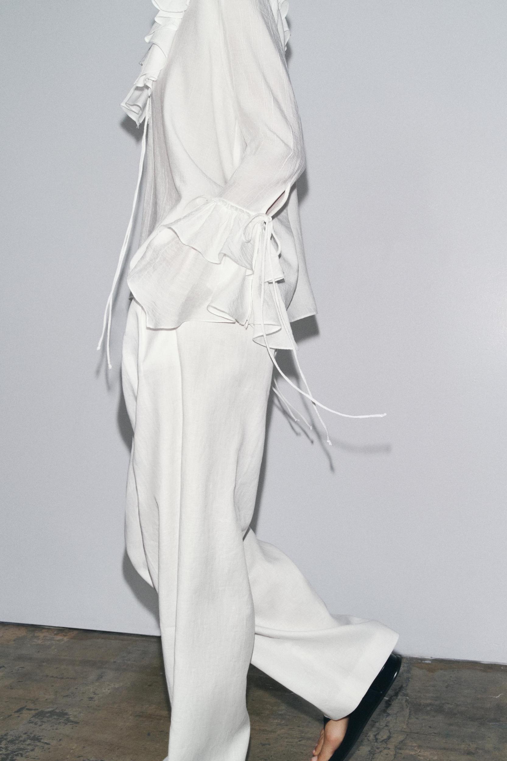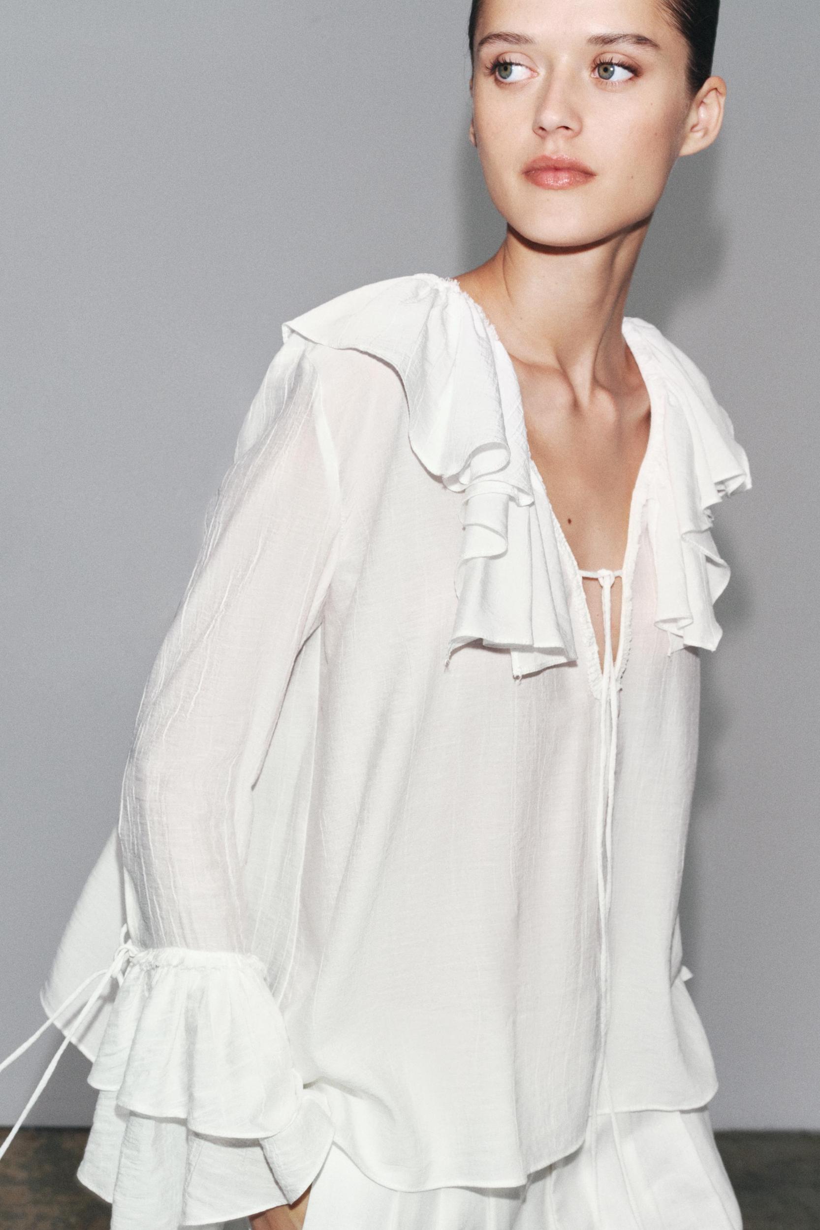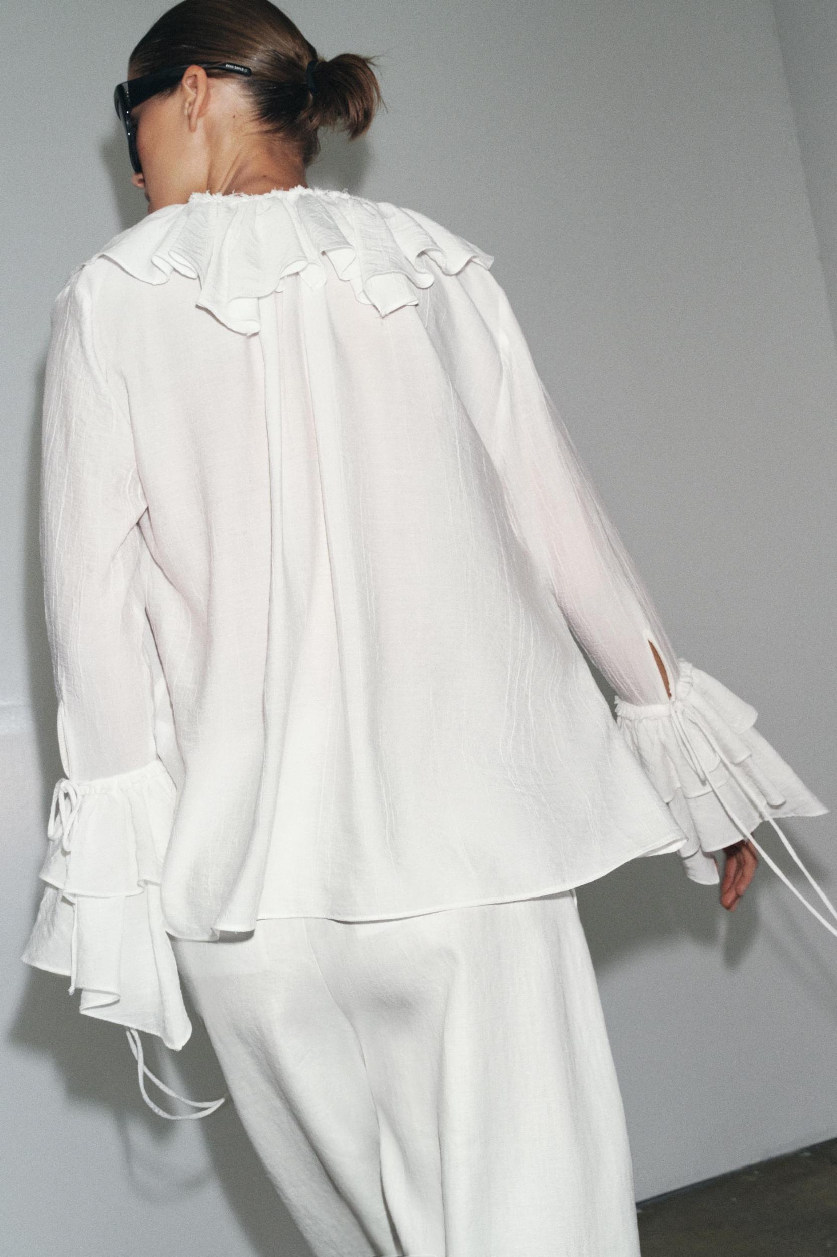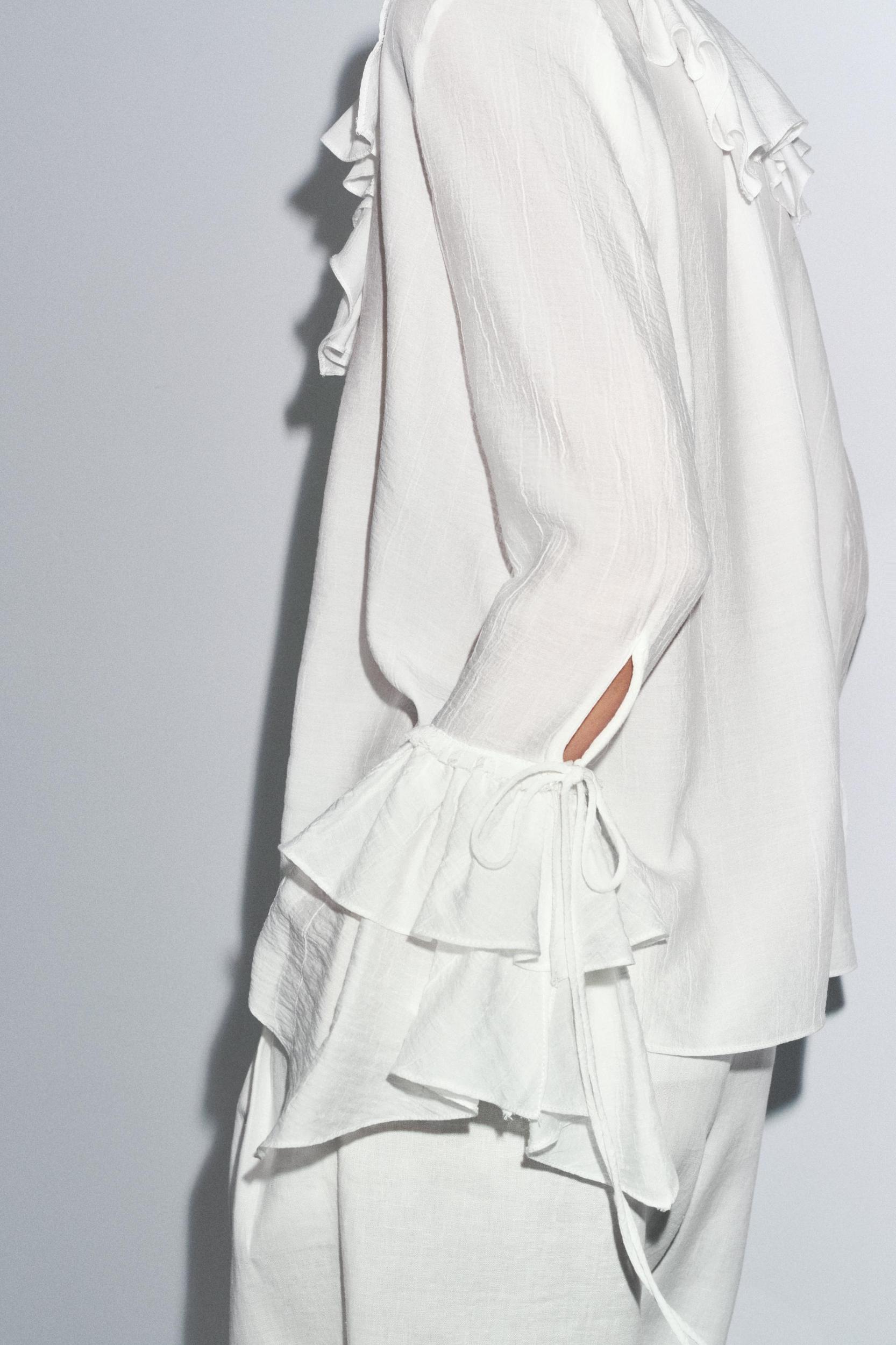 ZARA WOMAN COLLECTION Shirt made of viscose blend yarn. V-neck and long sleeves with ruffles in the same fabric, adjustable with drawstrings. Straight hem.