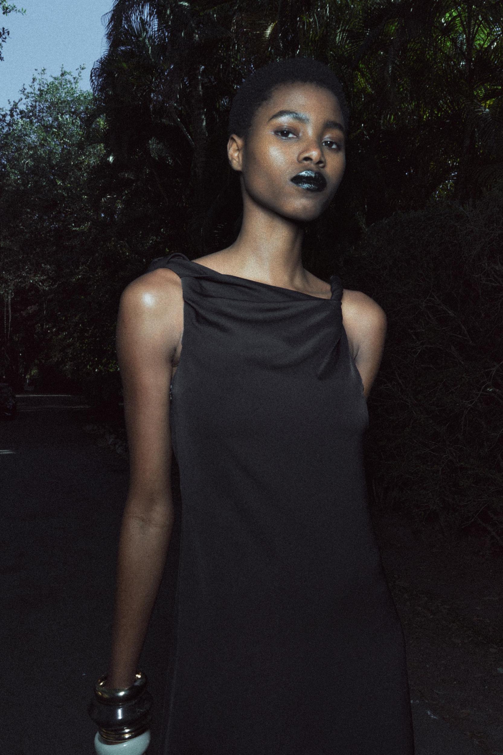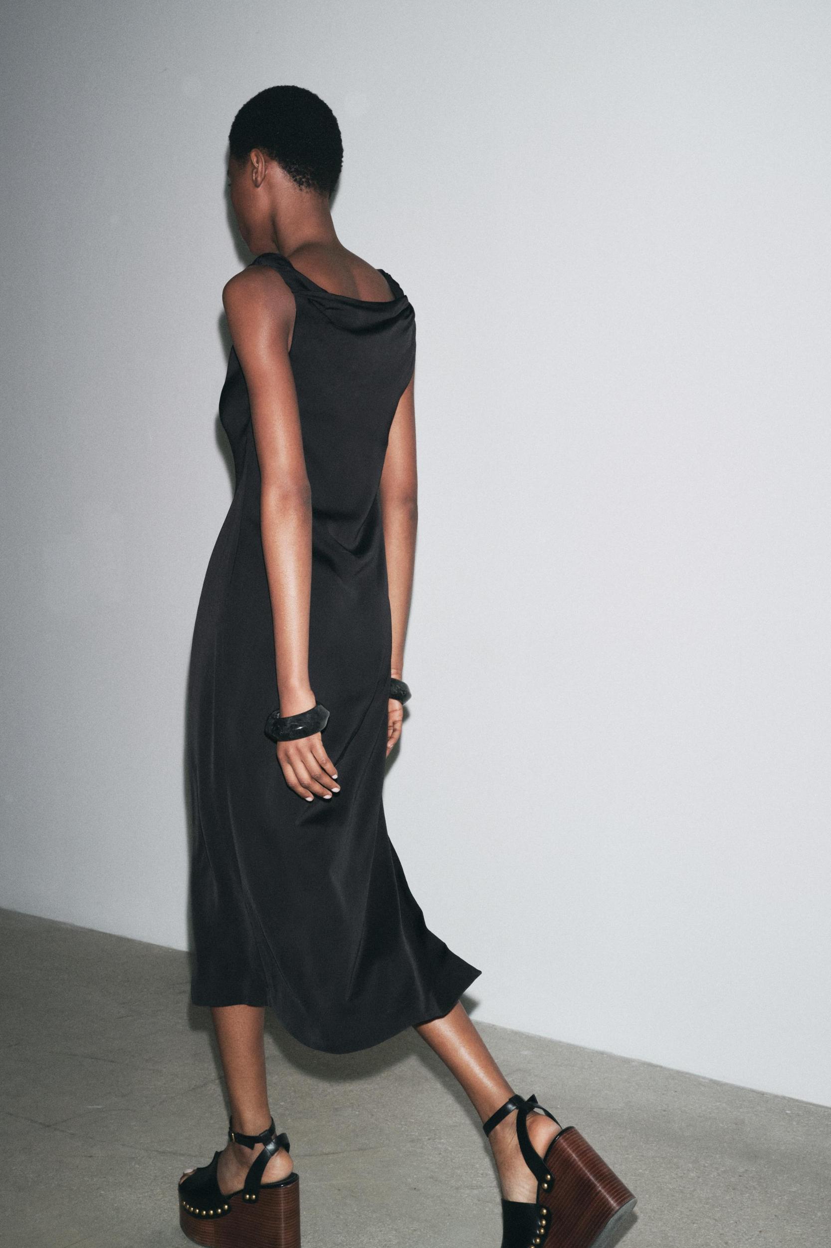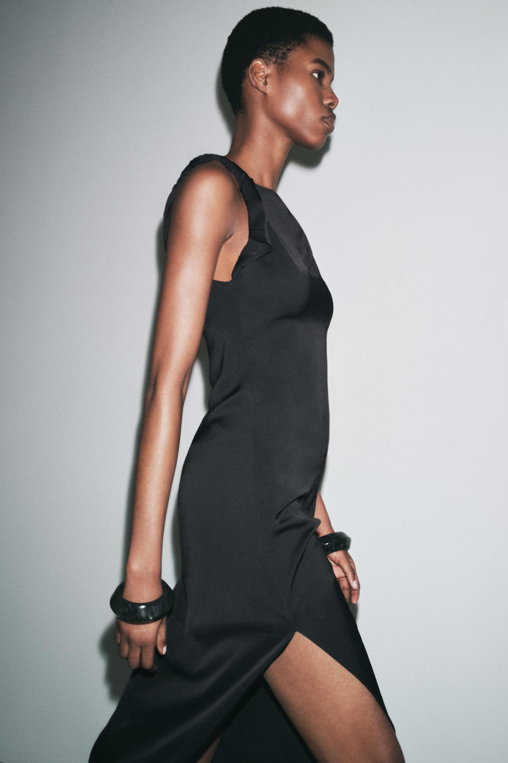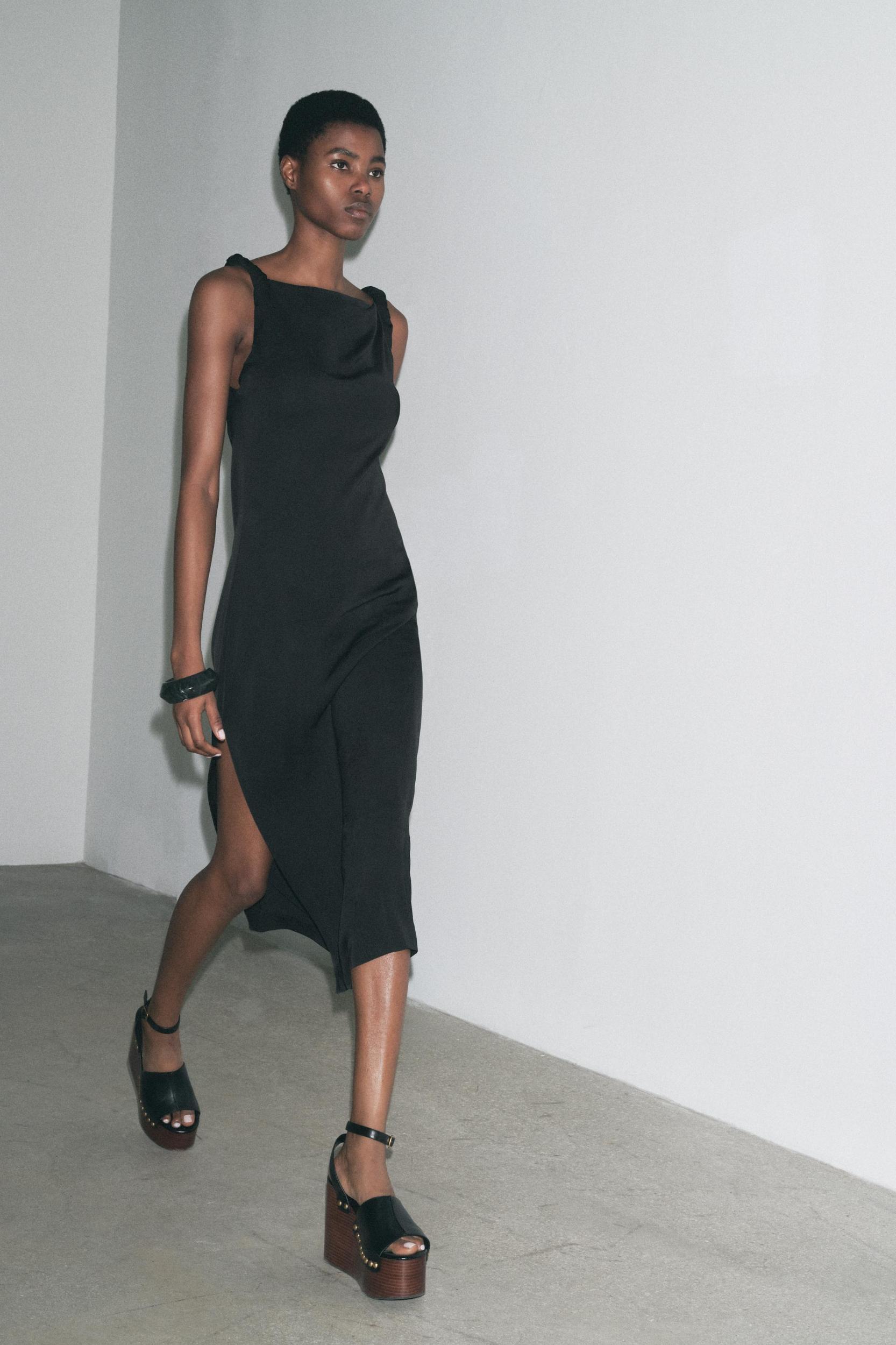 ZARA WOMAN COLLECTION Midi dress made of viscose yarn. Asymmetrical neckline and twisted straps. Hem with side slit. Concealed side zip closure.