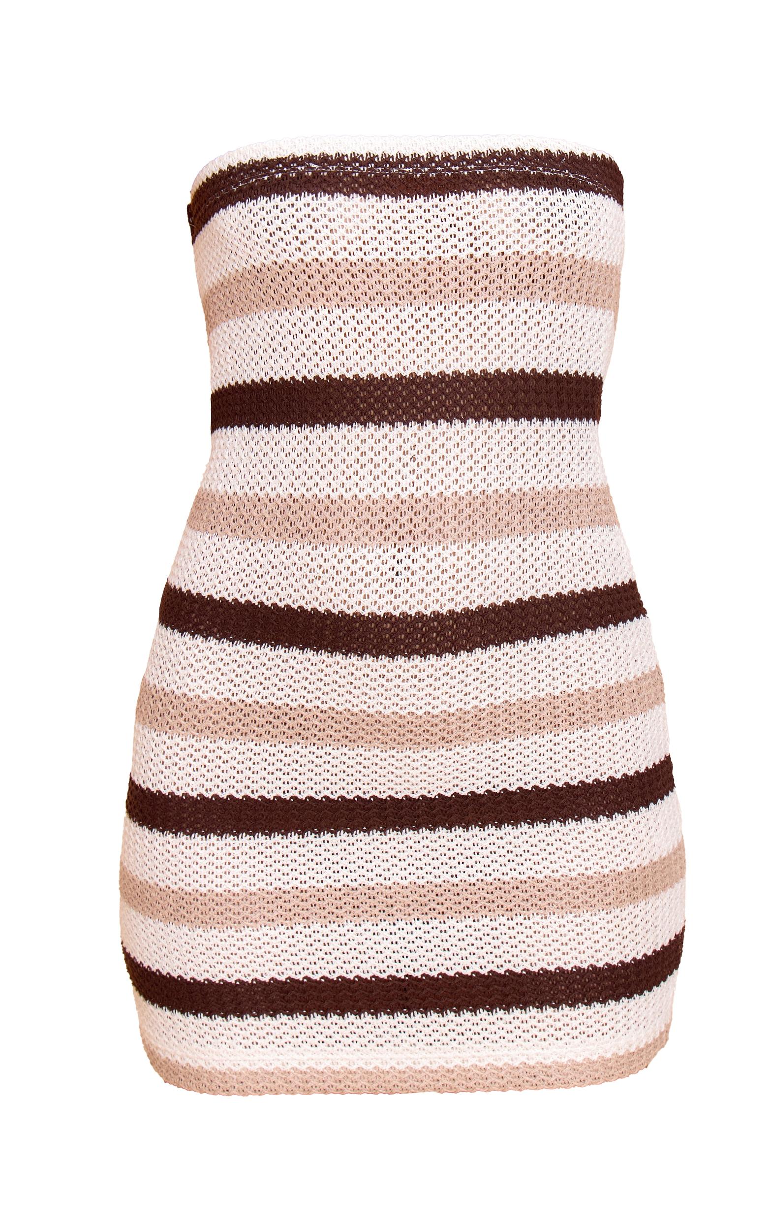 Sleek and sculpting, this strapless bodycon dress features a subtle striped texture in rich brown tones, offering a warm yet bold take on the classic silhouette. Ideal for nights out, wear it with a cropped faux leather jacket, hoop earrings, and heels for a confident, head-turning ensemble.Length approx 58.5cm/23inch (Based on sample size US 4)Model wears size UK 8/ EU 36/ AUS 8/ US 4Model Height - 5ft 7inchp]:!mb-4inch>Brand: PrettyLittleThingCategory: DressesProduct type: Bodycon DressColor: BrownMaterial: KnitNeckline: ScoopSleeves: Spaghetti StrapOccasion: Day
