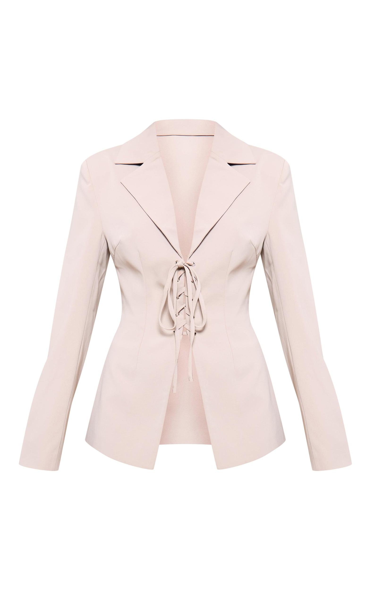 How unreal is this mushroom lace up tie front blazer? Brought to you in a mushroom hue material with a lace up tie front design, this blazer is everything you need and more. Style with tailored shorts, stiletto heel knee high boots and gold accessories for a chic finish everyone will be asking about. Length approx 68.5cm/27inch (Based on a sample size UK 8) Model wears size UK 8/ EU 36/ AUS 8/ US 4Model Height - 5ft 8inchp]:!mb-0inch>Category: OuterwearProduct type: Fitted BlazerColor: MushroomMaterial: Woven CrepeNeckline: V NeckSleeves: LongOccasion: Evening