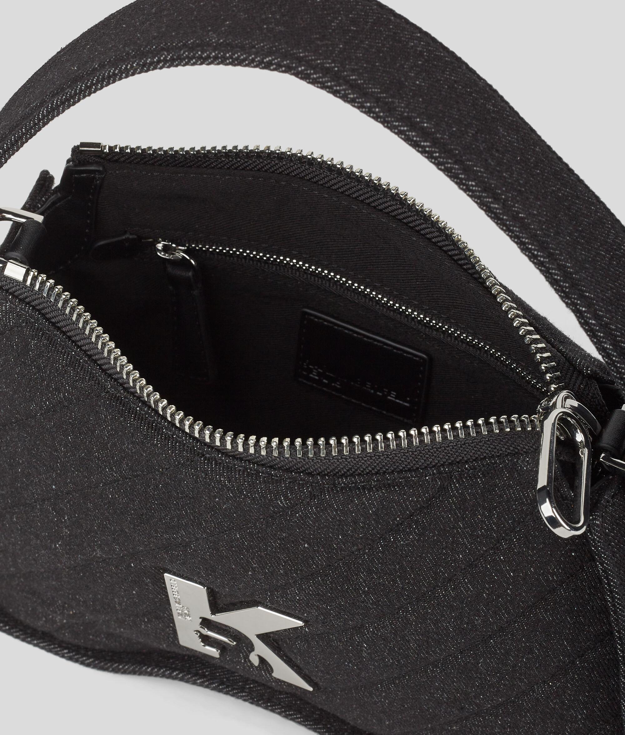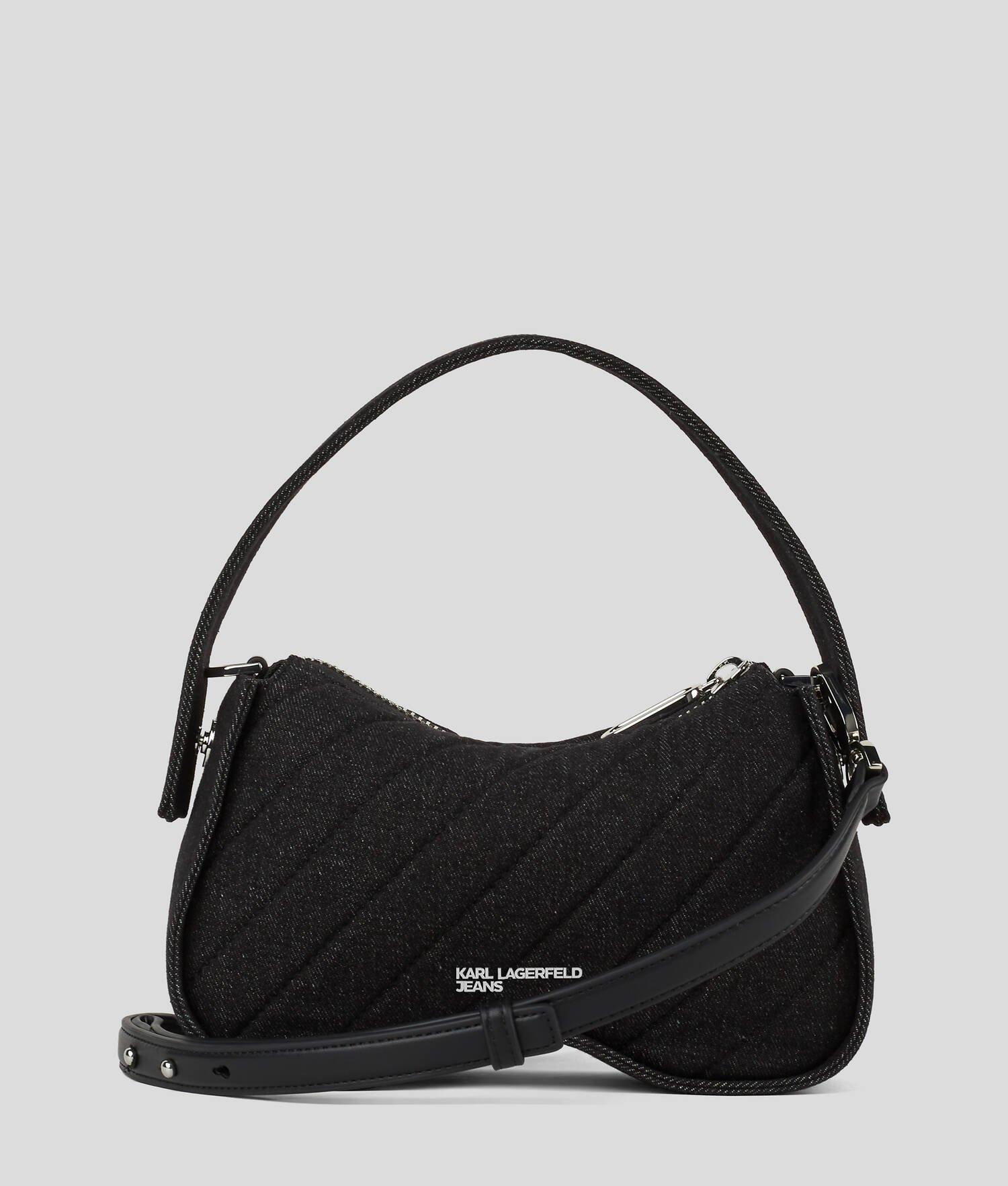 Embrace cutting edge creativity with this sunglasses-inspired bag, honoring the legendary Karl Lagerfeld. A quilted denim finish and bold K-logo hardware enhance its unique details, while a top handle and adjustable crossbody strap allow for versatile styling.