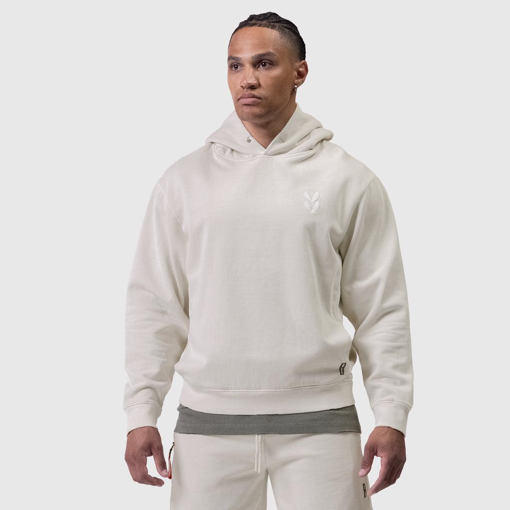 Pullover warm-up hoodie with subtle distressing at the hems for a vintage aesthetic. Constructed from a soft fleece that is anti-odor and stone-washed for a worn-in feeling. Featuring ribbed side panels with hidden hand pockets on each side. The hood offers custom matte black metal eyelets with “Relentless Pursuit” etching. Finished with embroidered branding on the chest.