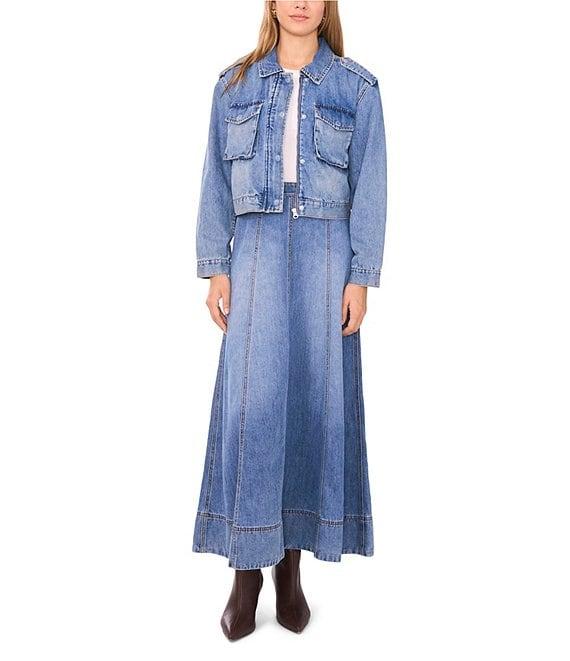From 1. STATE, this jacket features: Denim fabrication V-neckline Long sleeves Button-front and full zip closure Approx. 26" in length Cotton Machine wash/tumble dry Imported.