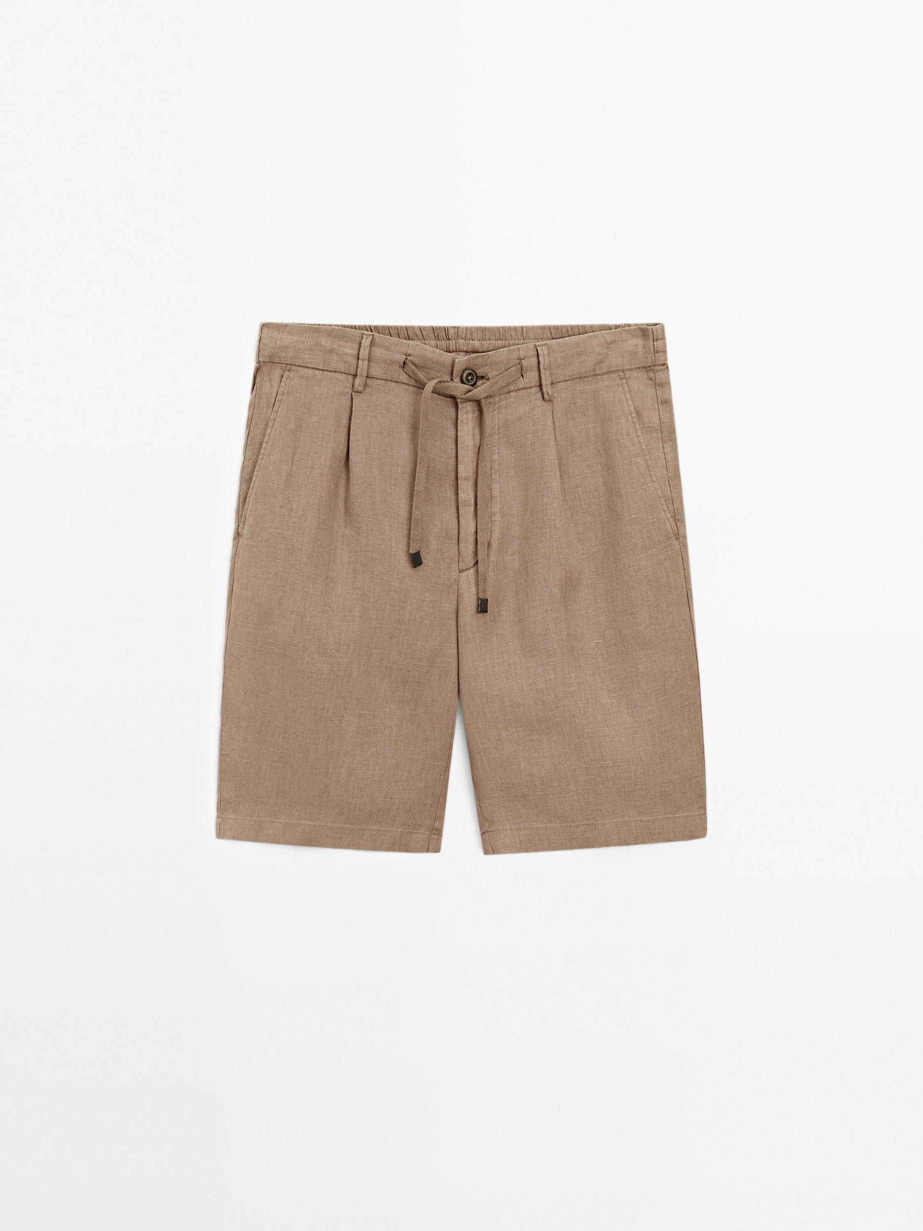 Bermuda shorts made of 100% linen , Elastic waist at the back, Front zip and top button fastening, Thin drawstring at waist level, Two side pockets, Two buttoned welt pockets on the back, Darted detail on the front