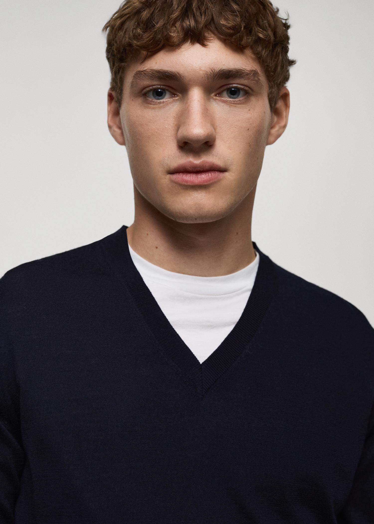 100% merino wool. Fine knit fabric. V-neck. Long sleeve with elastic cuffs. Straight hem. The model is 6'3" and is wearing a size M. Back length 28.54 in