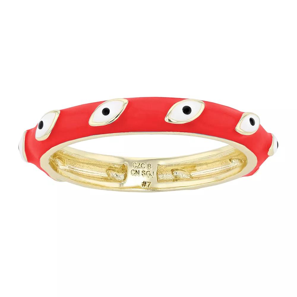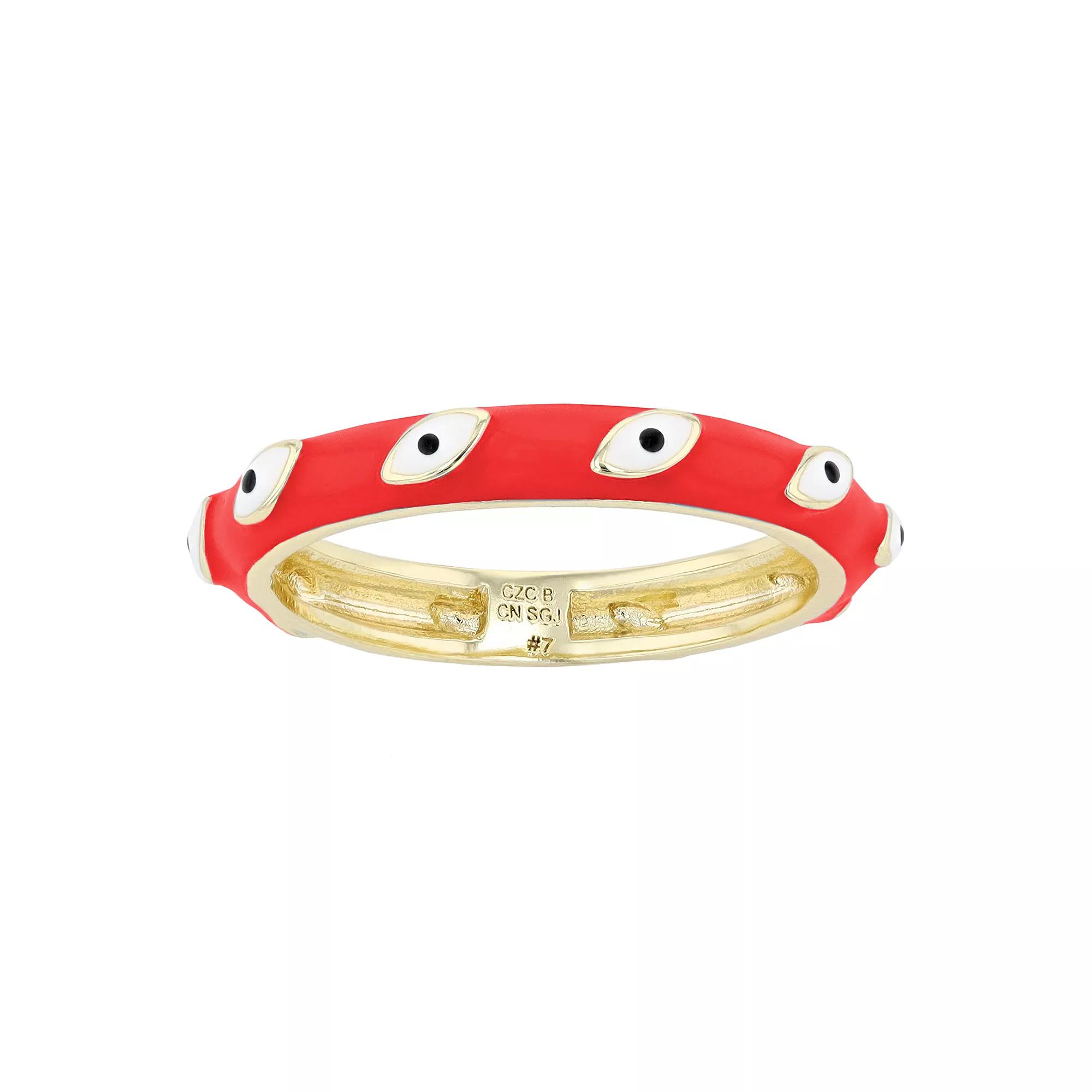 Add a pop of color to your wardrobe with this 14k Yellow Gold Plated White Evil Eye Ring. Click on this JEWELRY & WATCHES GUIDE to learn about fit, styles, materials and more! Add a pop of color to your wardrobe with this 14k Yellow Gold Plated White Evil Eye Ring. Click on this JEWELRY & WATCHES GUIDE to learn about fit, styles, materials and more! FEATURES Width: 3 mm Plating: 14k gold Metal: brass Shank style: stackable Band fit: comfort fit Finish: polished Packaging: velvety pouch Size: 5. Color: Red. Gender: female. Age Group: adult.