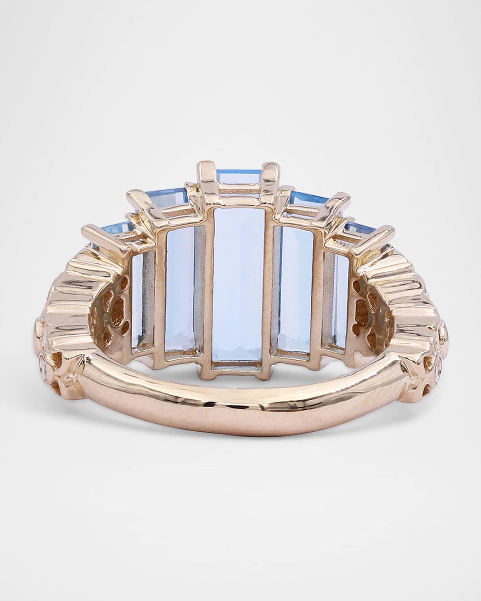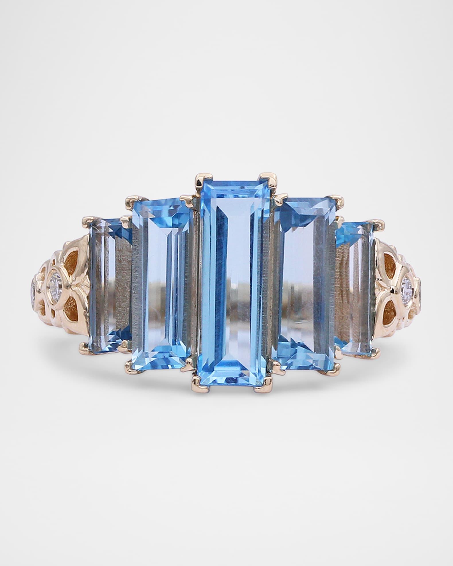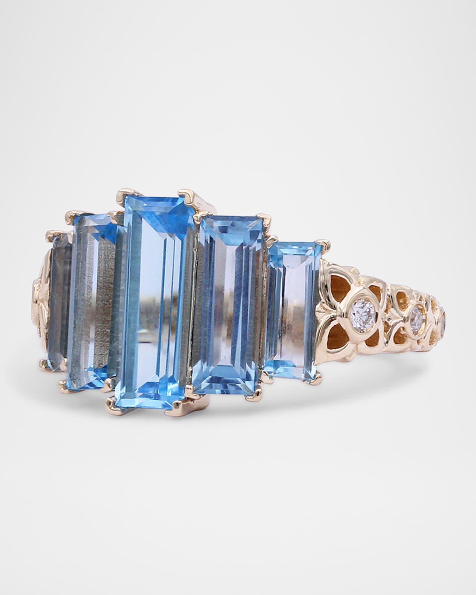 Stephen Dweck cocktail ring Approx. 0.9"L x 0.5"W Polished 18-karat yellow gold Six round white diamonds 0.15 total diamond carat weight Five baguette-cut Swiss blue topaz 6.18 total topaz carat weight Easily clean with soap and water, hand wash or dry clean Imported