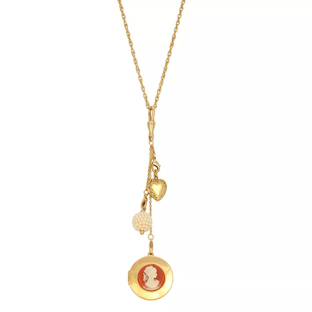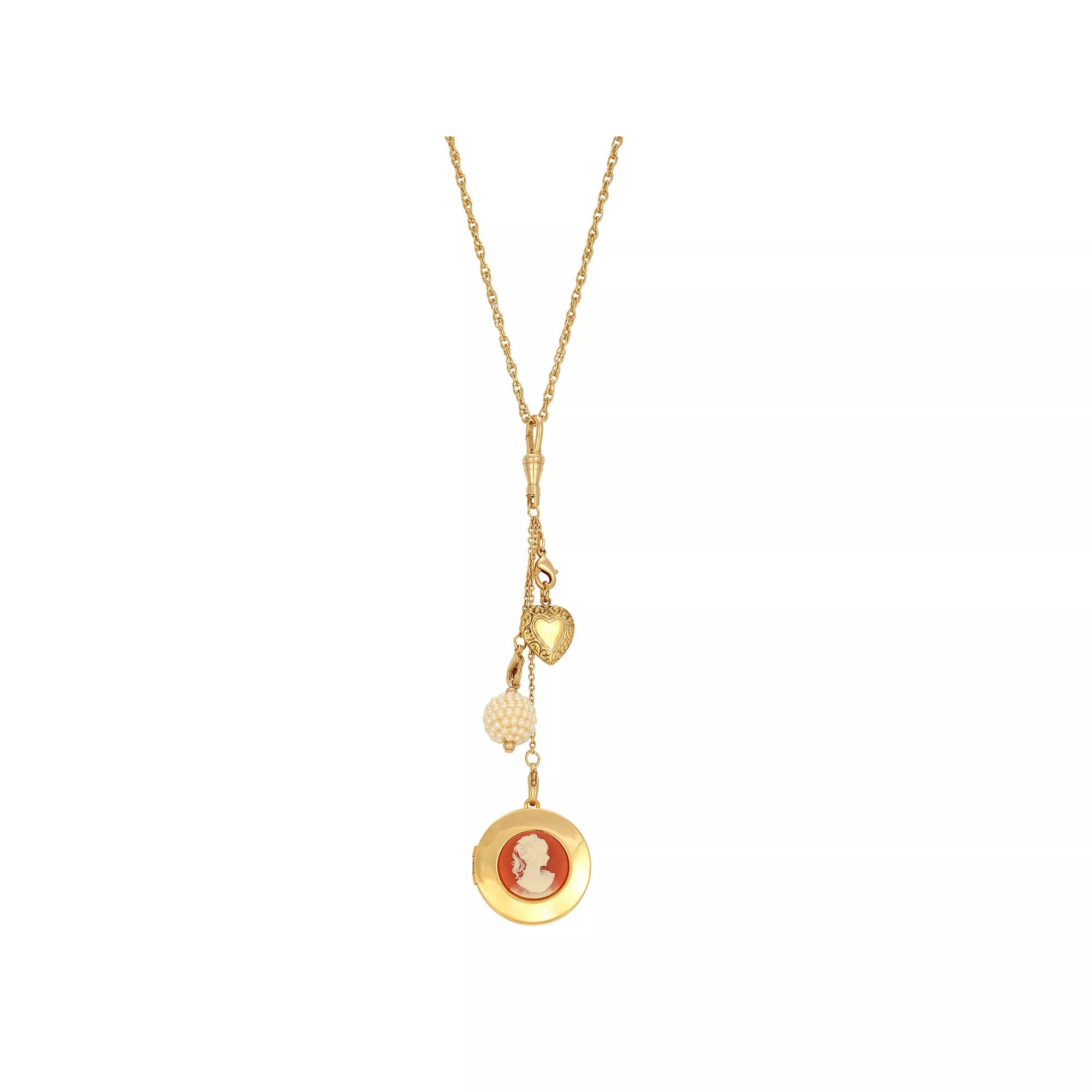 This vintage inspired long chain necklace from 1920 Jewelry features a trio of charms, including a gold-toned heart, fashion pearl sphere and a round simulated carnelian and ivory color cameo locket pendant set on an etched gold tone frame. | 1928 Jewelry 32 Inch Gold Tone Carnelian Cameo Round Locket With Charms Necklace