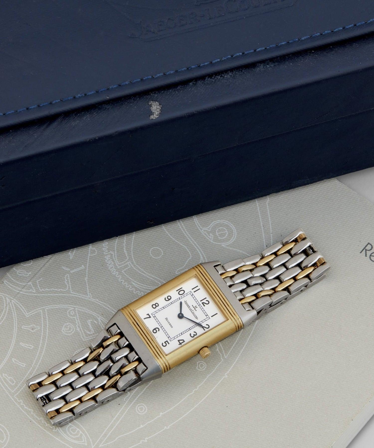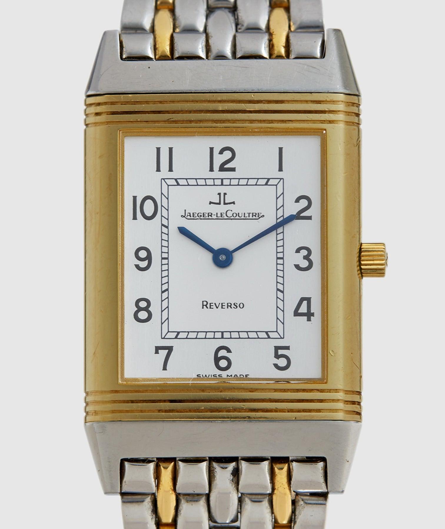 his 1990s Jaeger-LeCoultre Reverso Classique in steel and gold captures everything that makes the Reverso a design icon. With its clean Art Deco lines and signature reversible case, it’s a piece rooted in both elegance and function—originally created to withstand polo matches, now equally at home in refined daily wear. The two-tone case features a warm gold bezel framed by polished steel, paired with a silver dial accented by black Arabic numerals, blued hands, and a classic minute track. At just the right size, it wears slim and comfortably, true to the original spirit of the Reverso. Inside is a hand-wound Jaeger-LeCoultre movement—reliable and finely finished—tucked within the iconic flip case. Fitted with a leather strap, this piece offers understated sophistication and timeless appeal. A beautiful example of 1990s Reverso design, blending tradition and modernity in a watch that still feels fresh today. Model Number: 250.5.86 Movement Type & Caliber: Manual Case Diameter: 23 x 38 Serial Number: 2039854 Made in Switzerland in 1990s Comes With Foundwell 1-Year Warranty and Original Box and Papers Style Number: FWW1672 Shipping Notice: Due to the high value of this product, purchases may take up to 2 business days to process and ship. Return Policy: Because this watch is a vintage, one-of-a-kind piece, all purchases are final sale and excluded from any promotions.