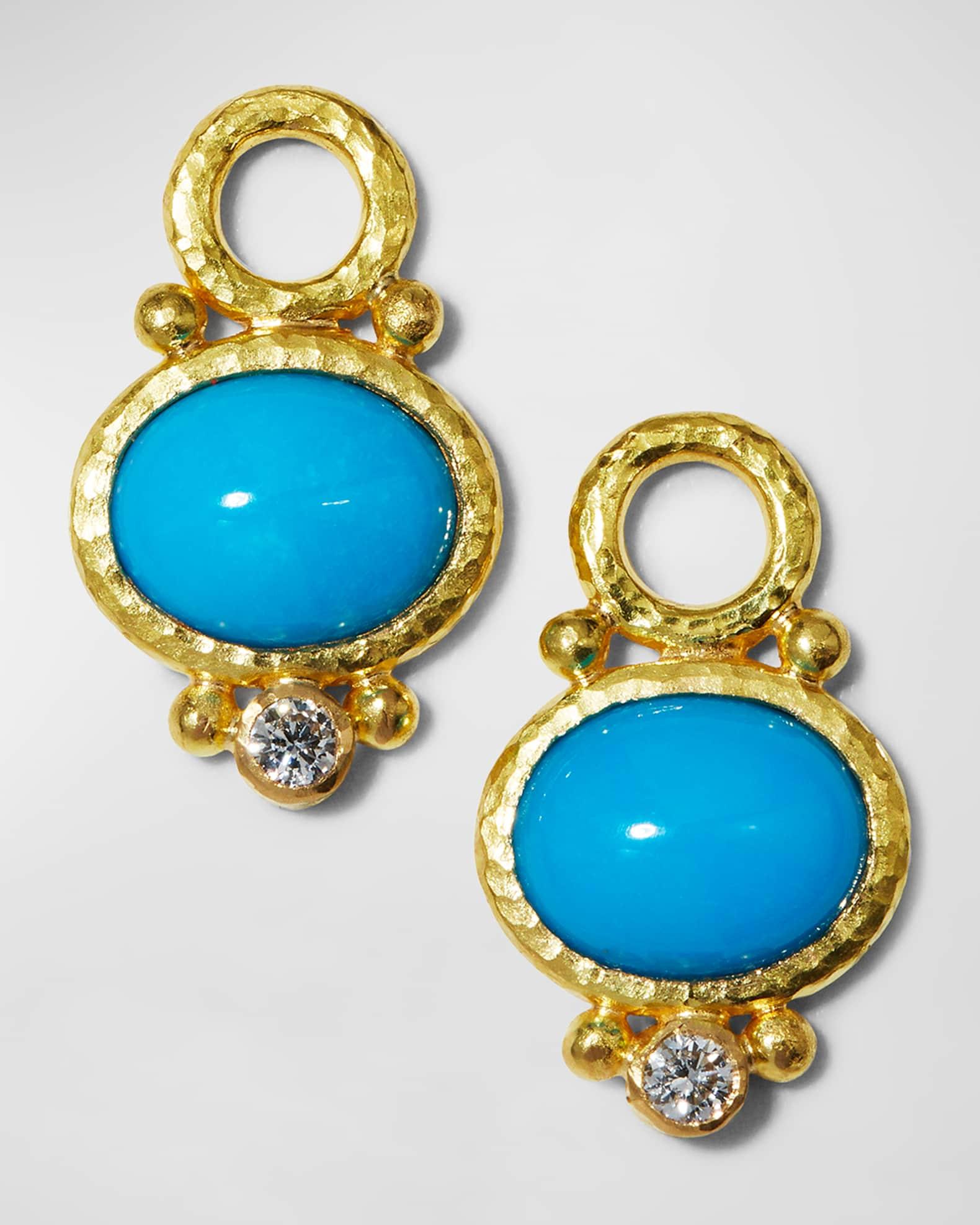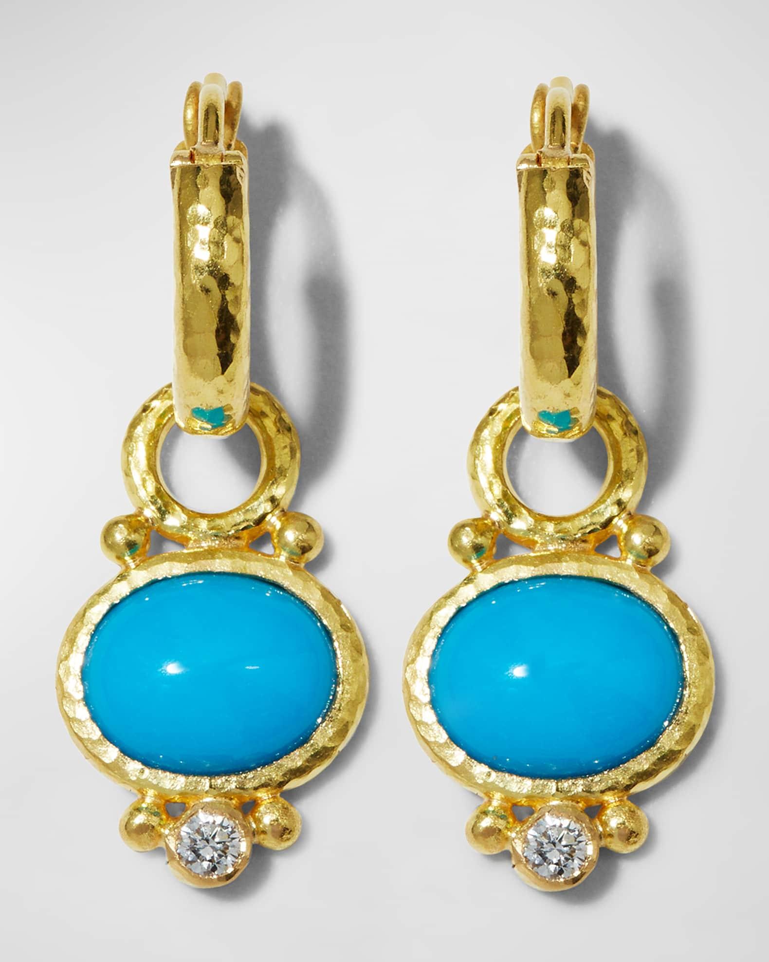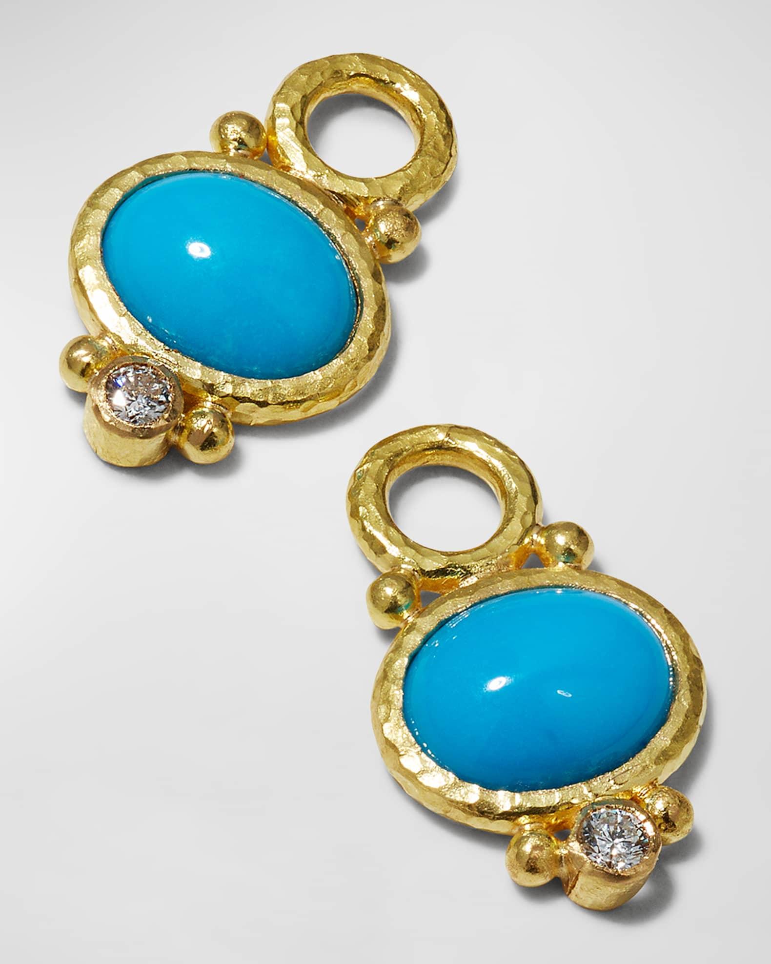 Elizabeth Locke Sleeping Beauty turquoise earring charms. Signature 19-karat hand-hammered gold. 8x10mm turquoise oval at bezel-set center. 2.5mm round white diamond at base. 0.12 total diamond carat weight. Earrings sold separately. Approx. 13x12mm. Imported.