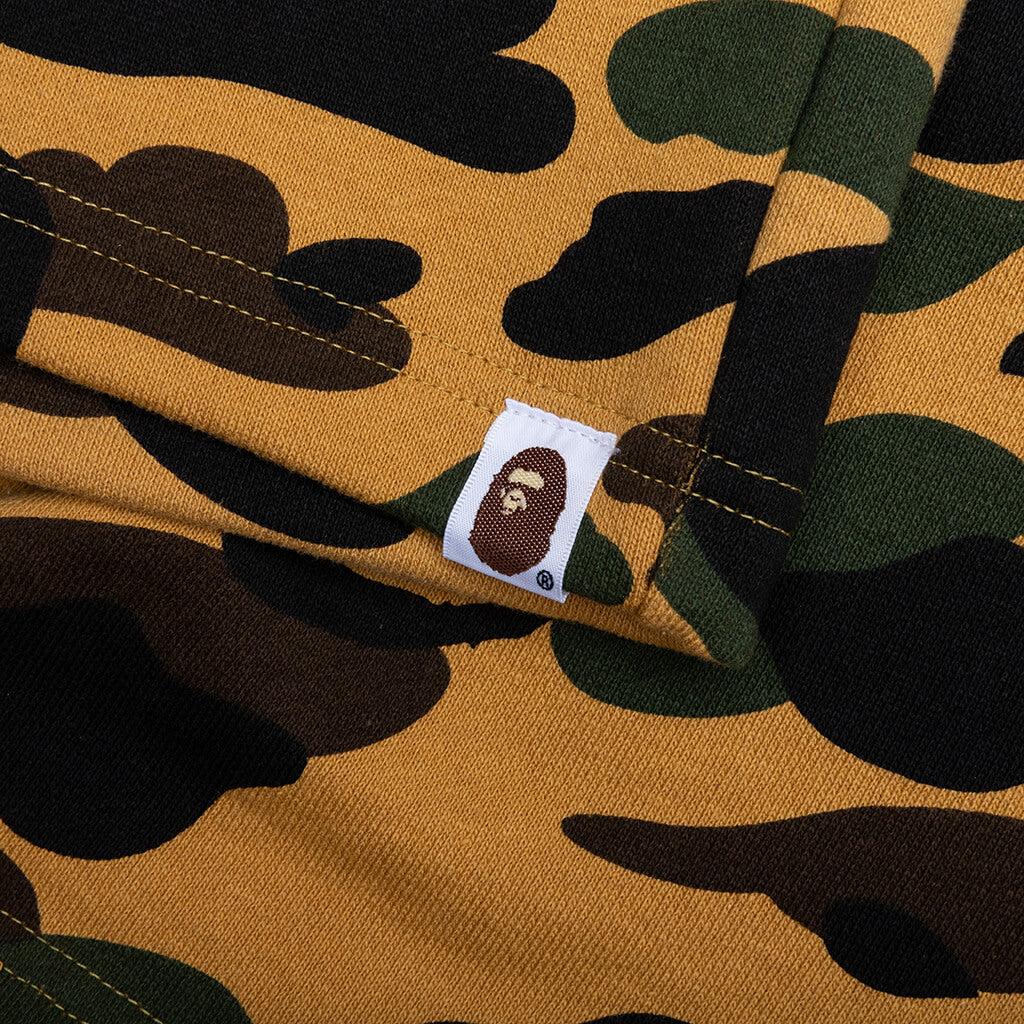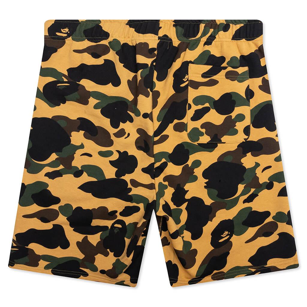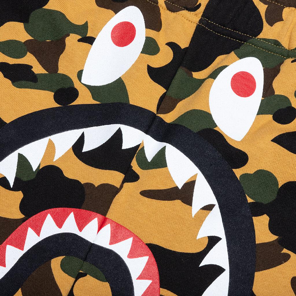 Perfect for everyday wear, the 1ST Camo Shark Regular Fit Sweat Shorts merges comfort with signature BAPE character. Made from soft cotton, the shorts are covered in its classic camo print and decorated with the Shark face graphic across the front for instant recognition. Practical features include an elastic waistband with internal drawstrings, side-seam pockets, and a rear pocket. 100% Cotton Allover camo print Elastic waistband with internal drawstrings Side-seam pockets Rear pocket Screen-printed Shark face graphic Woven brand tag at hem Style No: 001SPL301009M-YEL