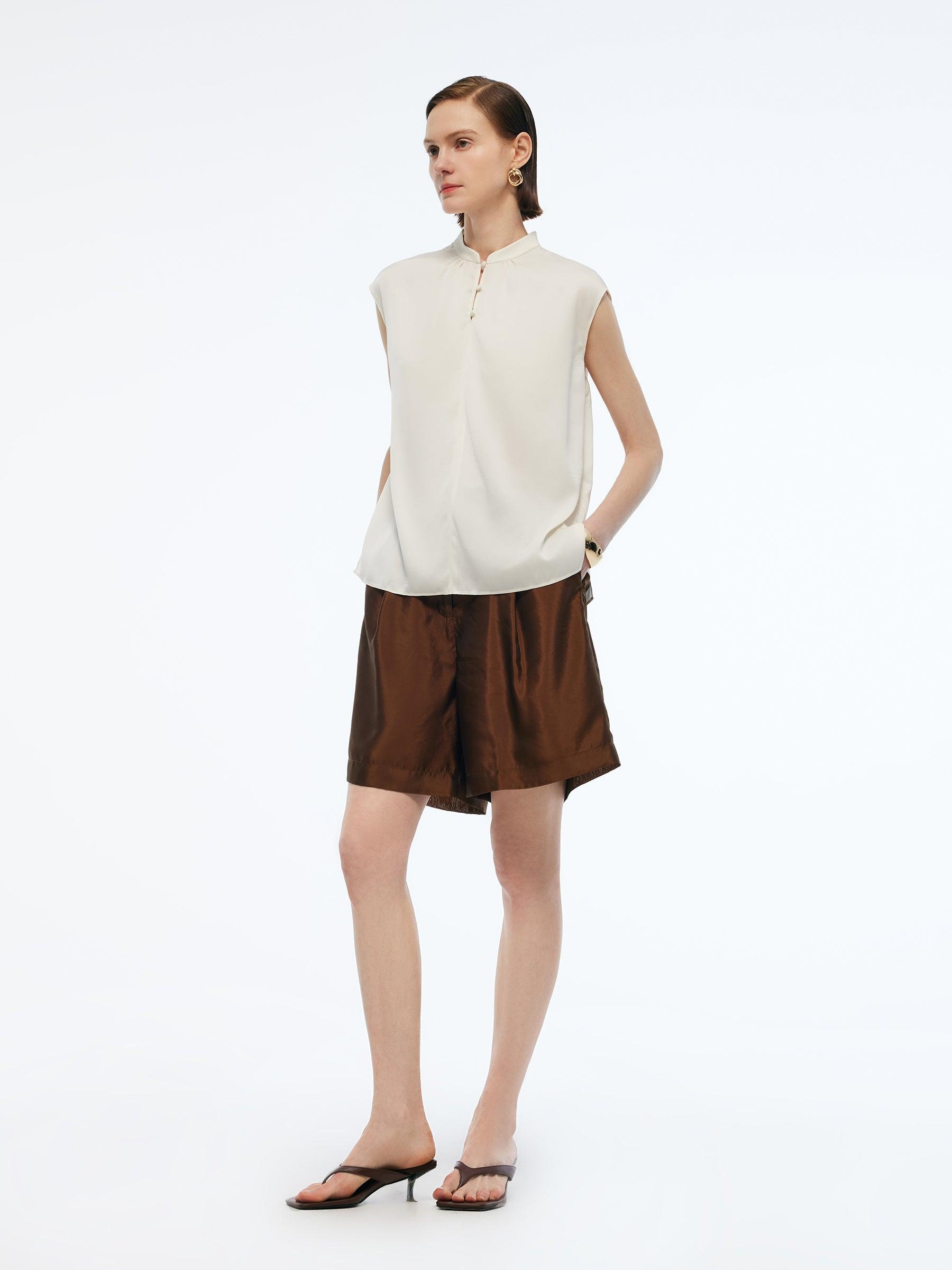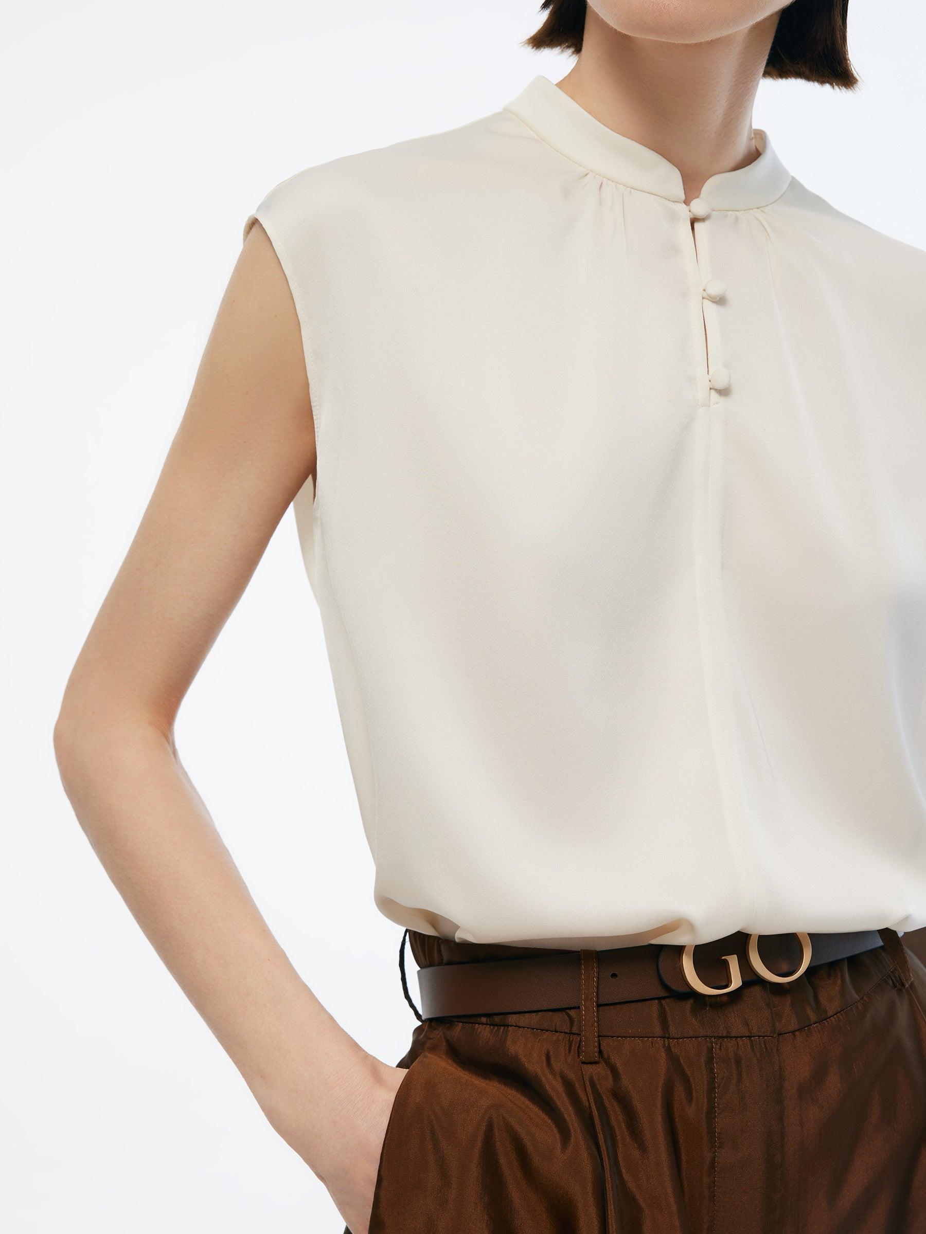 -22MM Mulberry Stretchy Silk -New Chinese-style -Wrinkle-free A blend of traditional Chinese aesthetics and modern fashion. This blouse is cut from 22MM Stretchy Mulberry Silk in a fitted straight silhouette which accentuates your curves beautifully. The cap sleeves add traditional charm with contemporary flair, while