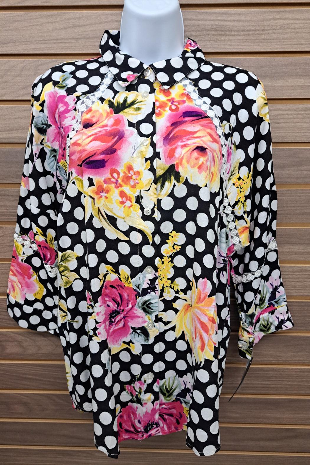 This 3/4 sleeve polka dot floral is perfect for adding a playful and feminine touch to any outfit. Its mix of floral and polka dot prints adds a unique and eye-catching design, making it a fashionable and stylish choice. 100% rayon