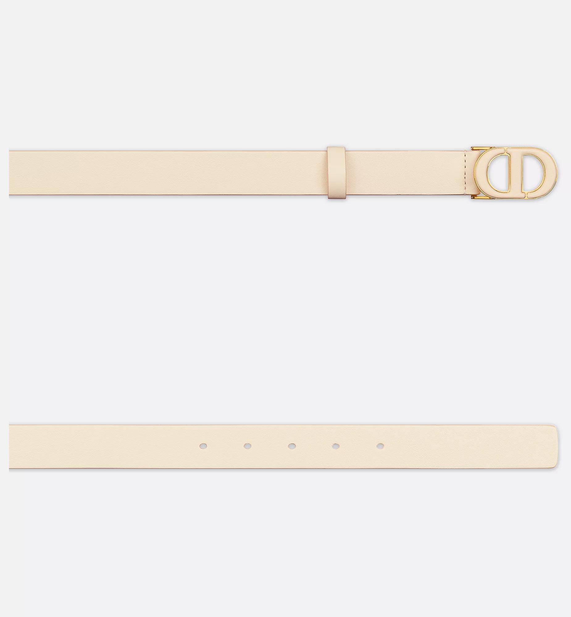 The 30 Montaigne belt is inspired by the hallmark namesake bag. Exemplifying House savoir-faire, the light ivory smooth calfskin style is enhanced by the iconic CD buckle in shiny gold-finish metal and tonal calfskin. The contemporary, elegant belt can be paired with jeans, a skirt or a dress. 30 Montaigne CD buckle. Christian Dior Paris signature on the interior. Shiny gold-finish metal and calfskin detailing. 90% calfskin, 10% brass. Made in Italy