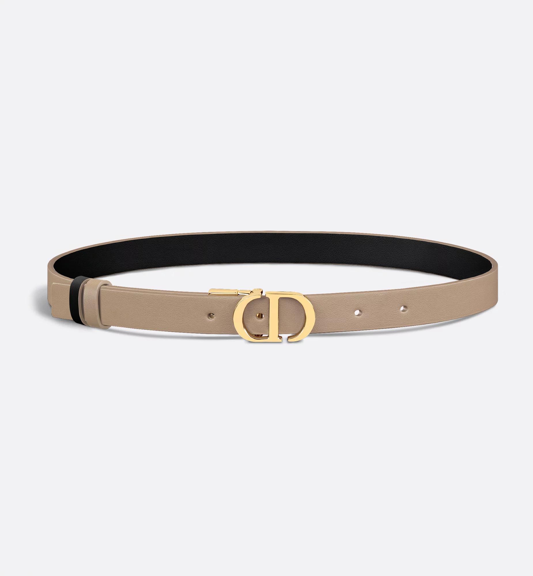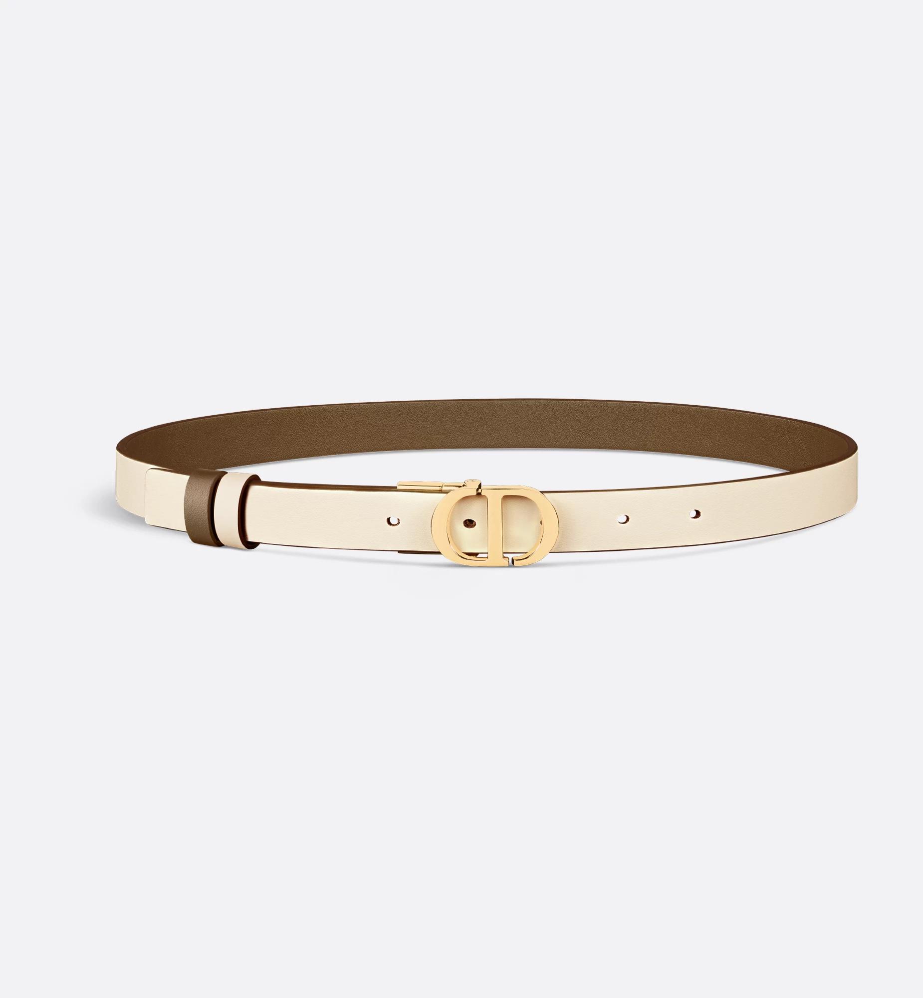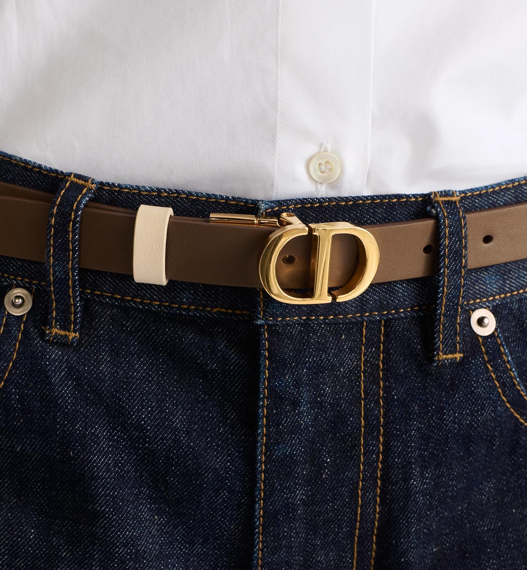 Inspired by the hallmark namesake bag, the 30 Montaigne belt is offered in a reversible variation, thanks to its swivel mechanism. Crafted in smooth calfskin showcasing tobacco brown on one side and light ivory on the other, it is embellished with the iconic CD buckle in shiny gold-finish metal. The design also features two removable loops that can be worn in a tonal or contrasting fashion. The timeless accessory elegantly highlights the waist and will coordinate well with jeans, a skirt or a dress. 30 Montaigne CD buckle. Shiny gold-finish metal detailing. Two removable loops. 95% calfskin, 5% brass. Made in Italy