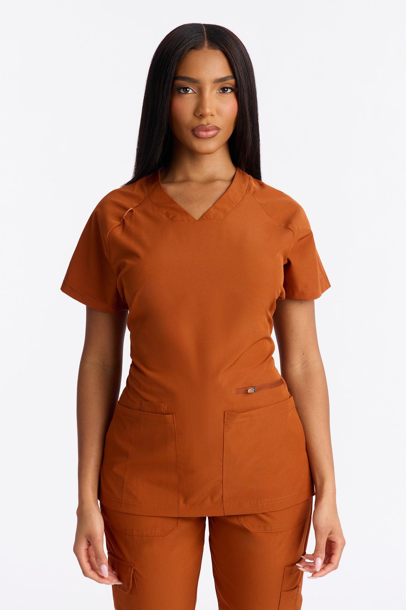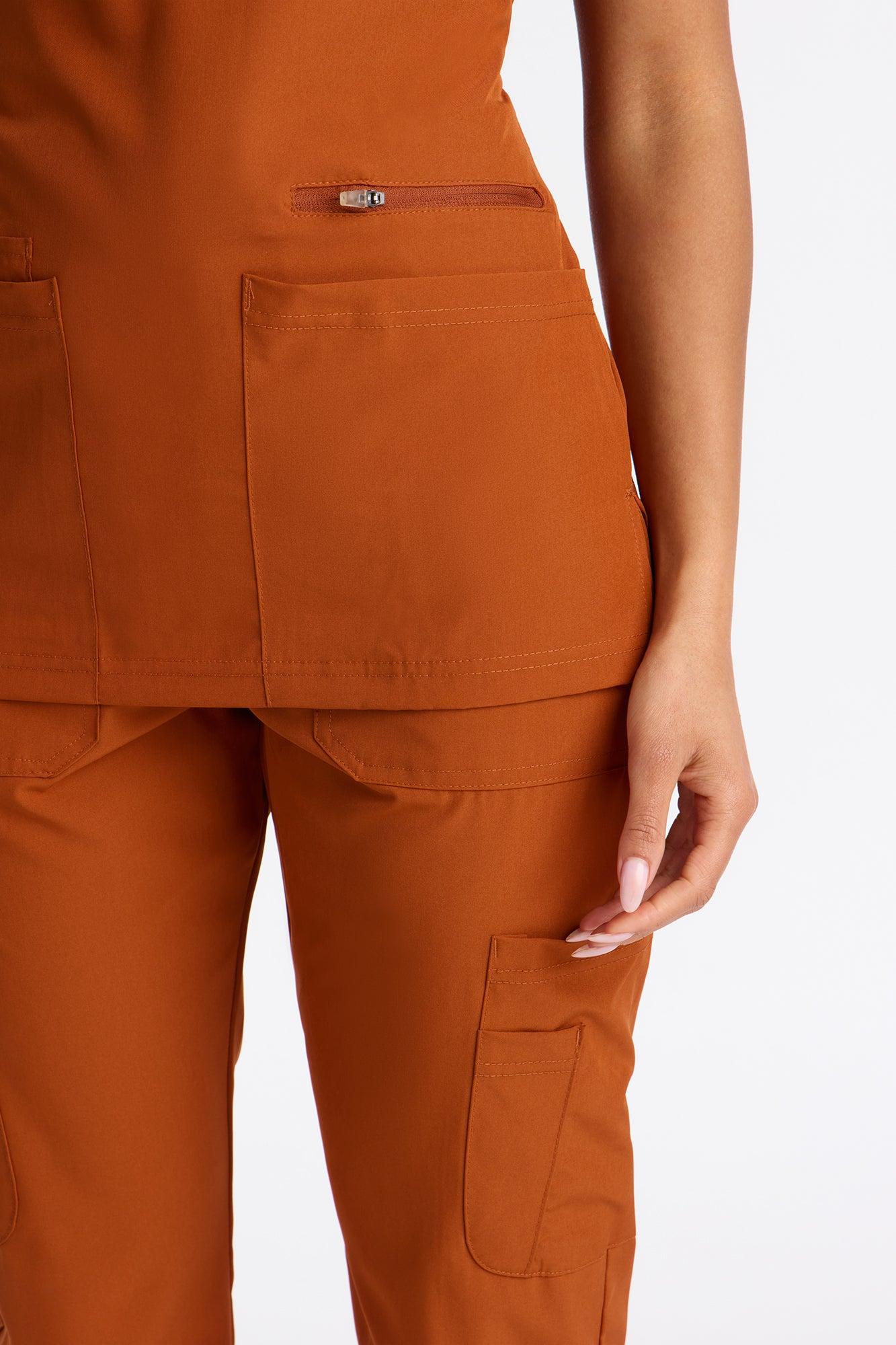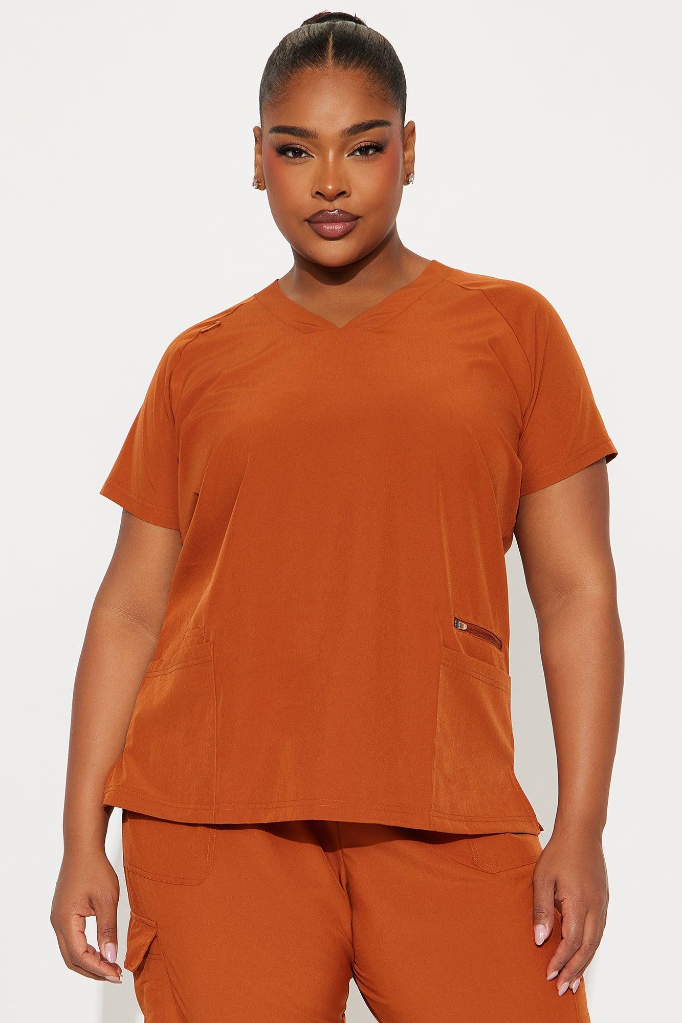 Available In Cognac. Uniform Scrub Set Short Sleeve Bungee Detail Front Side Pocket Elastic Drawstring Waistband Patch Pocket Detail Elastic Jogger Cuff Stretch 93% Polyester, 7% Spandex Final Sale Imported California Proposition 65WARNING: Cancer and Reproductive Harm - www.P65Warnings.ca.gov.