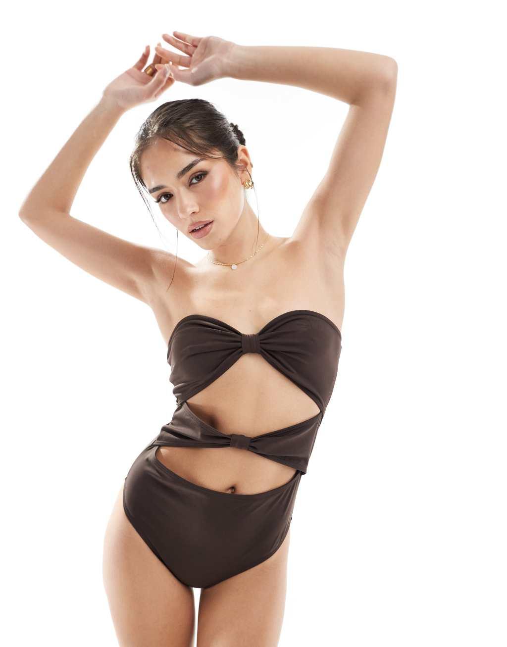 4th & Reckless bandeau knot front cutout swimsuit in brown