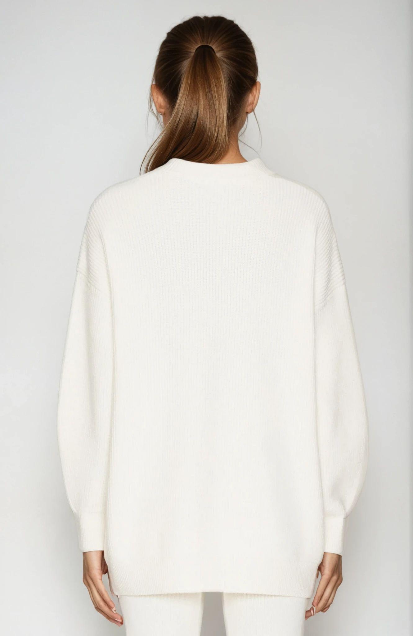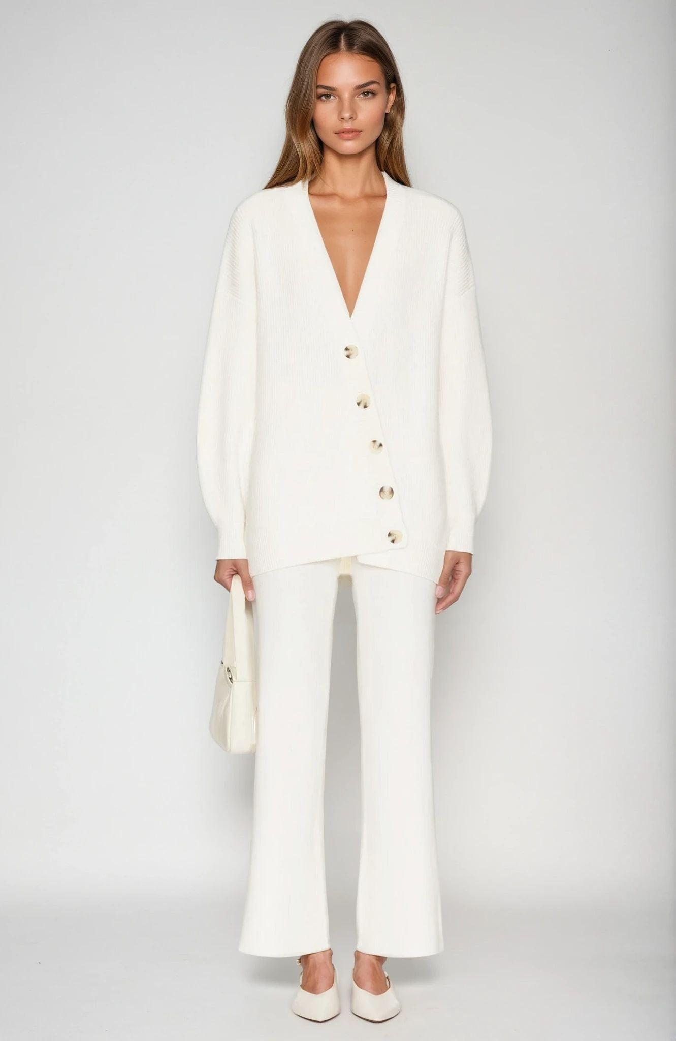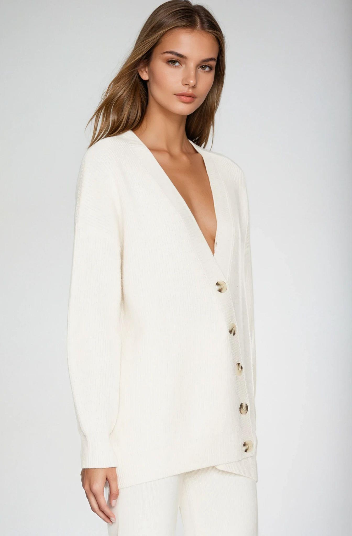 The 525 Evelyn Cardigan features an asymmetrical button-down design with an oversized fit. It includes a front slant button closure and ribbed trim, crafted from a heavyweight knit fabric for added warmth and comfort.