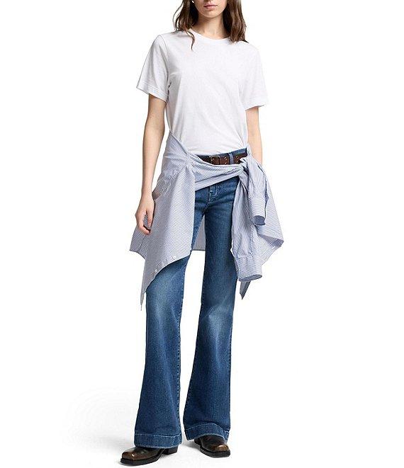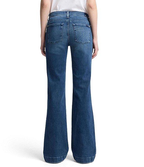 From 7 For All Mankind, these jeans feature: Denim fabrication Dark wash Mid-rise waistline Zipper fly with button closure Flare leg silhouette Signature 7 back pocket with crystal embellishments Approx. 34" inseam Cotton/Elastane/Polyester Machine wash cold/Dry flat Imported.