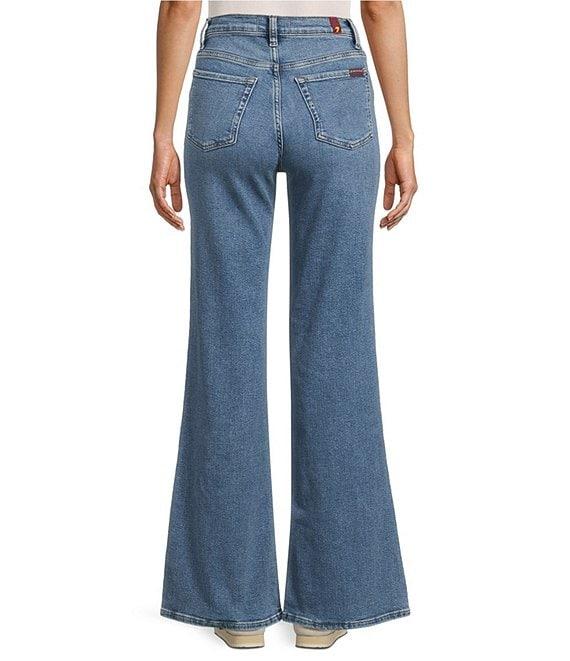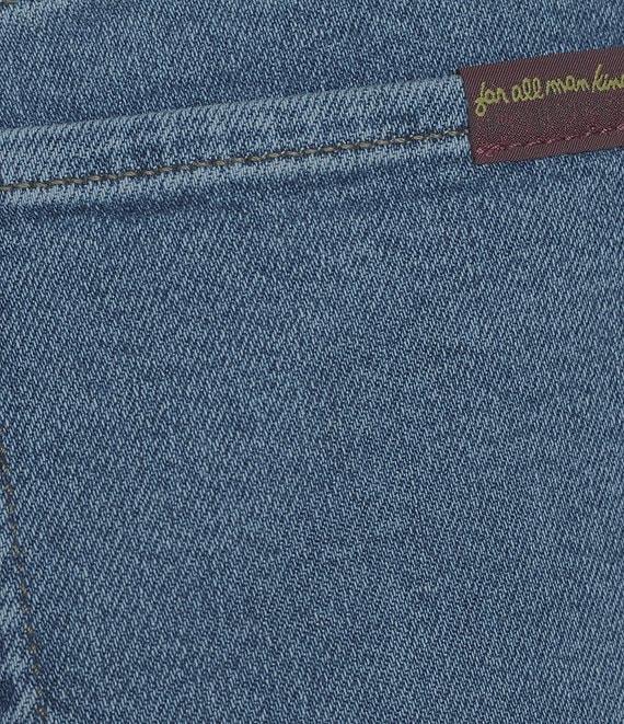 From 7 For All Mankind, these jeans feature: Denim fabrication Medium wash High-rise waistline Front zipper fly with button closure Flare leg silhouette Classic 5-pocket styling Front patch pockets Button embellishment detail Approx. 32" inseam, 11" rise, 23" leg opening Cotton/Modal/Elastomultiester/Elastane Machine wash/Dry flat Imported.