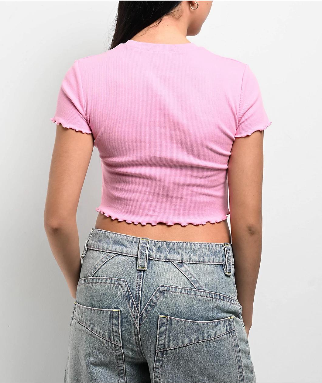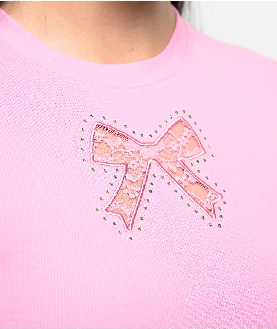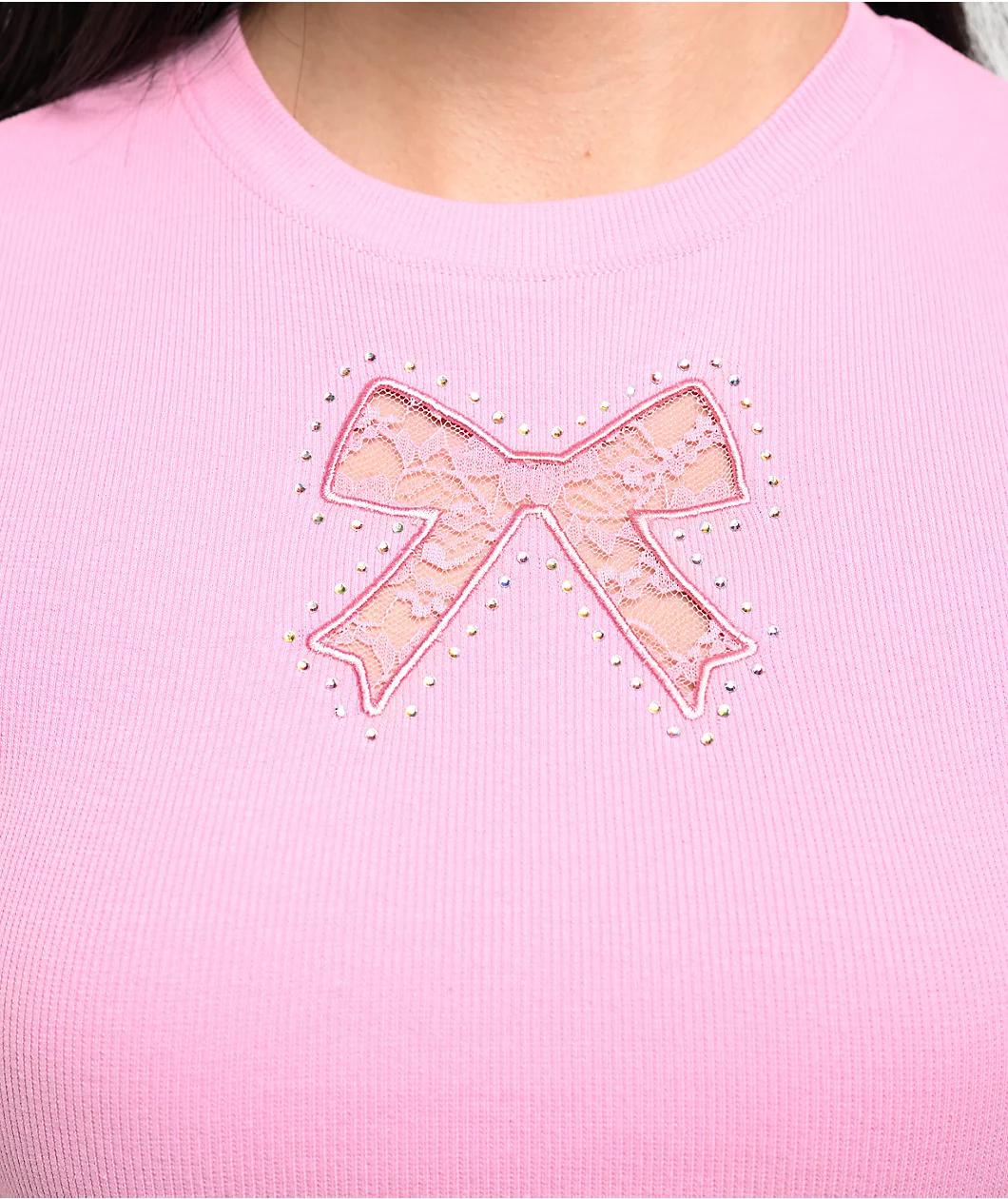 Combining cute and coquette, A.LAB welcomes the Katrina crop t-shirt in a muted pink color with a hemmed Cutout on the chest in the shape of a Bow - framed by flashy rhinestone detailing. Filling the Bow with patterned lace, the drop-shoulder cropped