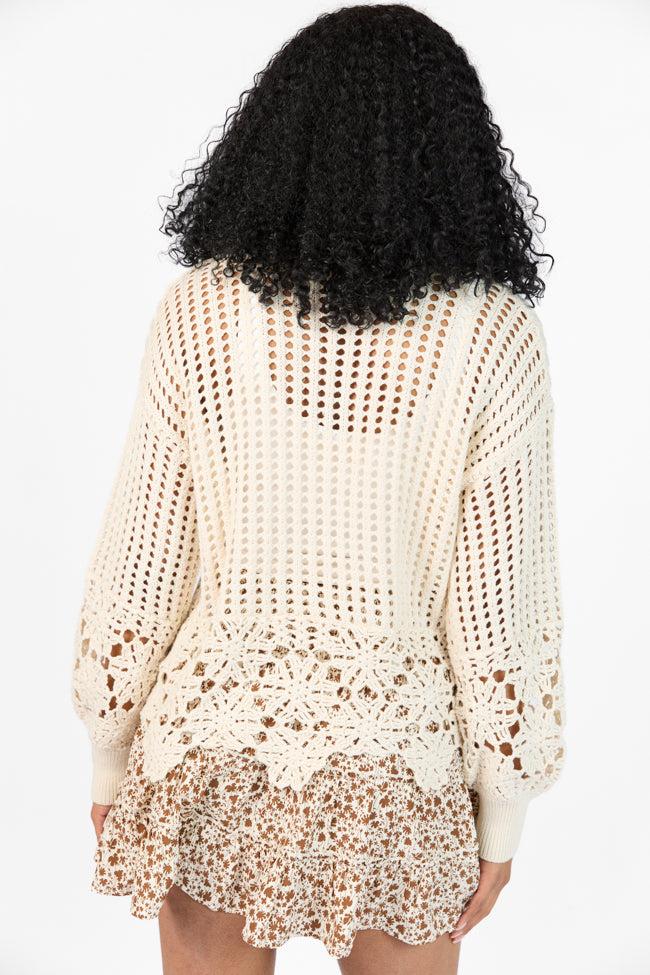 Details Crew Flower Trim Crochet Sweater Open knit fabric has some stretch Crew neckline with ribbed hem, flower trim detail Pair this sweater with shorts! UNLINED Size small from shoulder to hem: 21" Material and Care 55% cotton 45% acrylic Hand wash cold, dry flat Patterns may vary Materials may have natural variations Colors may vary from different viewing devices