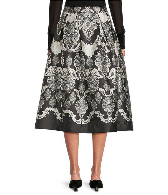 From A Loves A, this skirt features: Woven fabrication Brocade damask print High rise waistline Pull-on construction Side zipper closure Side seam pockets A-Line silhouette Classic fit Flounce hemline Midi length Approx. 32" HPS in length Polyester Machine wash on cold gentle cycle, wash with similar colors and fabrications, promptly remove from wash, hang on line to dry, use cool steam iron if needed. Imported. Dillard's Exclusive