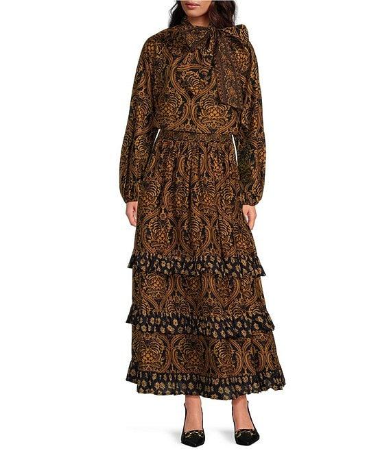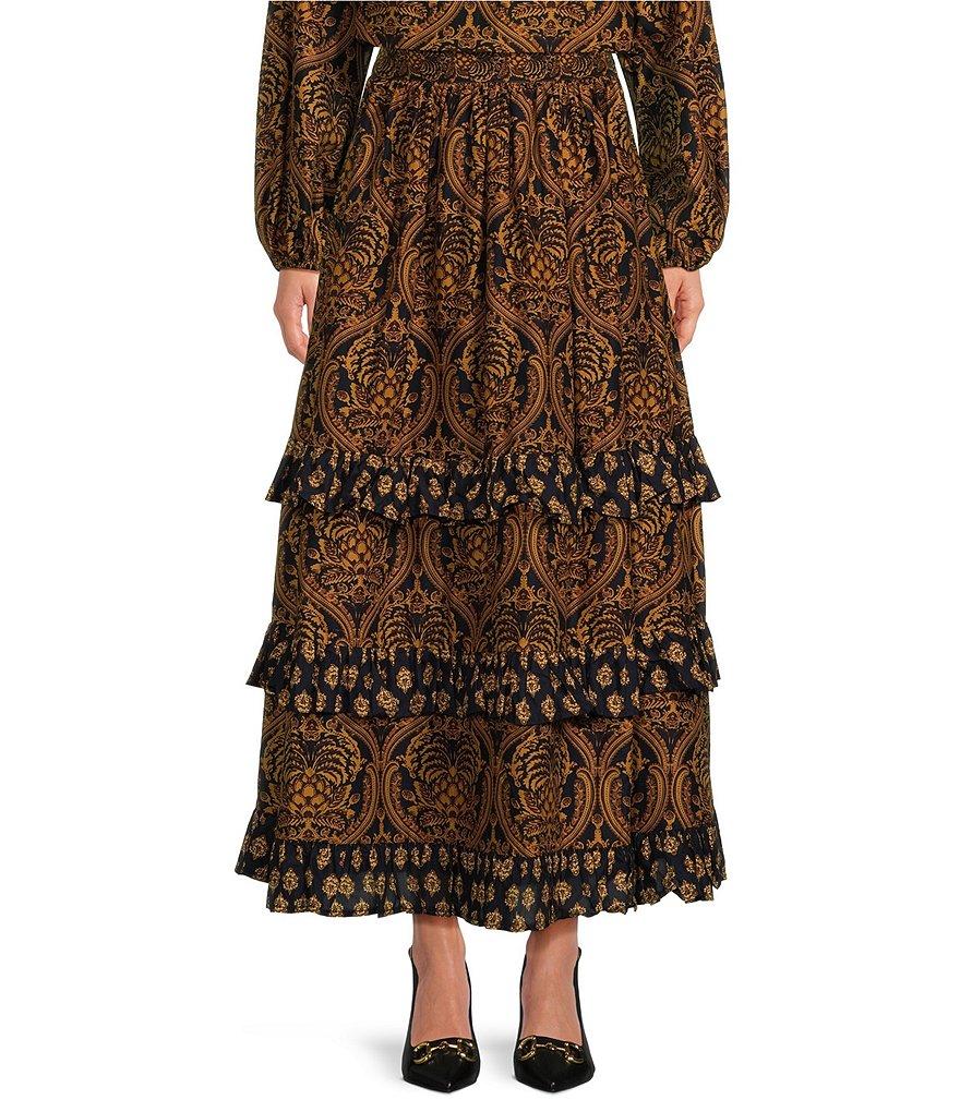 From A Loves A, this skirt features: Damask print Voile fabrication High rise waistline Ruched Tiered ruffle dress skirt Fully lined Maxi length Ruffle flounce hemline Pull-on construction Side hook & eye with zipper closure Approx. 55" in length Cotton Machine wash on cool gentle cycle, wash with similar colors and fabrications, use non-chlorinated bleach if needed, tumble dry on low cycle, use warm steam iron on low as needed. Imported.