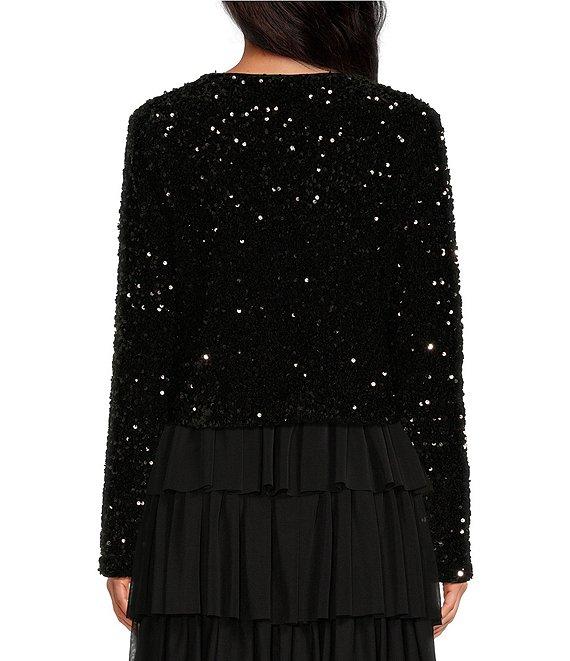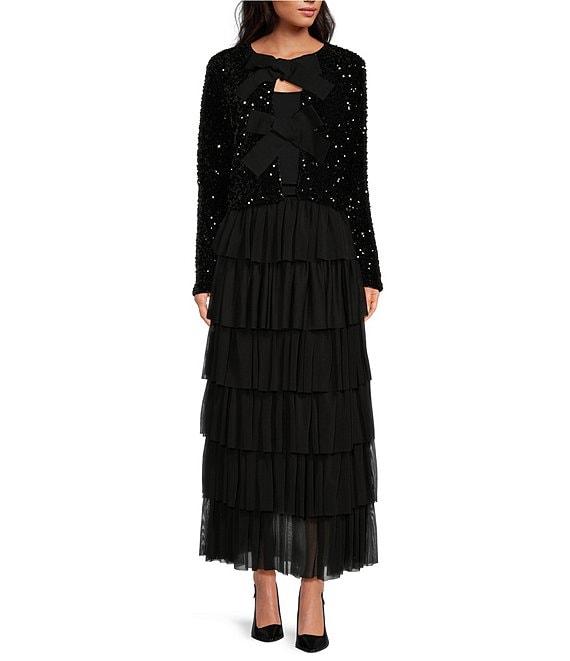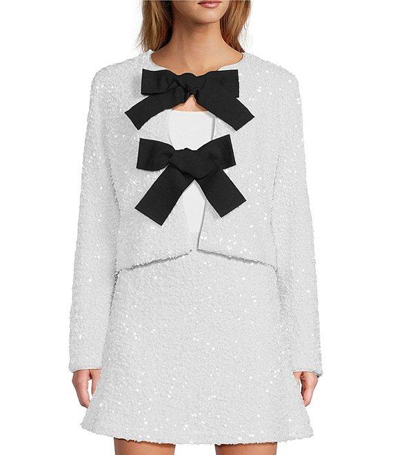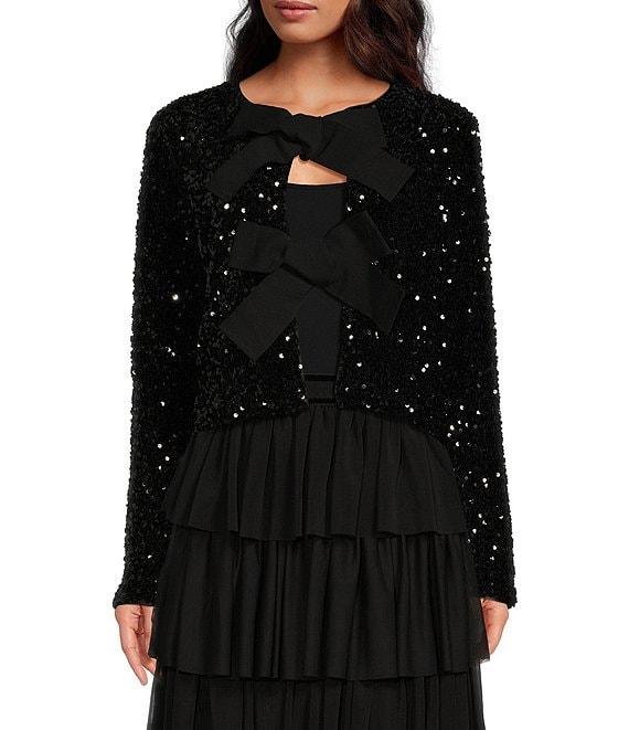 From A Loves A, this cardigan features: Sequin Fabrication Cardigan Silhouette Round Neckline Long Sleeves Classic Fit Straight Hemline Cropped Length Pull-on Construction Bow Tie Front Closure Approx. 19.5" in Length Polyester, Spandex Hand wash separately in cold water, hang on line to dry Imported. Dillard's Exclusive