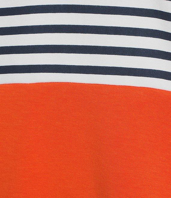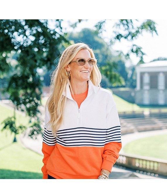 From Addison Bay, this sweatshirt features: Colorblock stripe pattern Stand mock neckline Long sleeves with cuffs Relaxed fit Straight hemline Quarter zip front closure Approx. 23.5" Cotton/rayon/polyester Machine wash cold, tumble dry Imported.