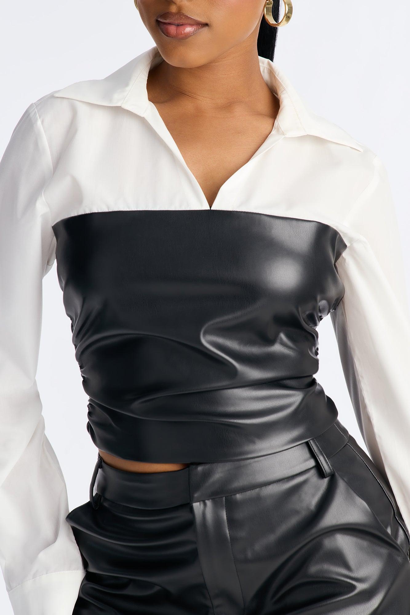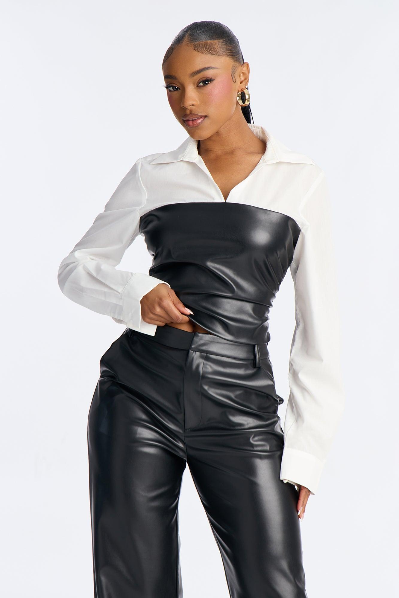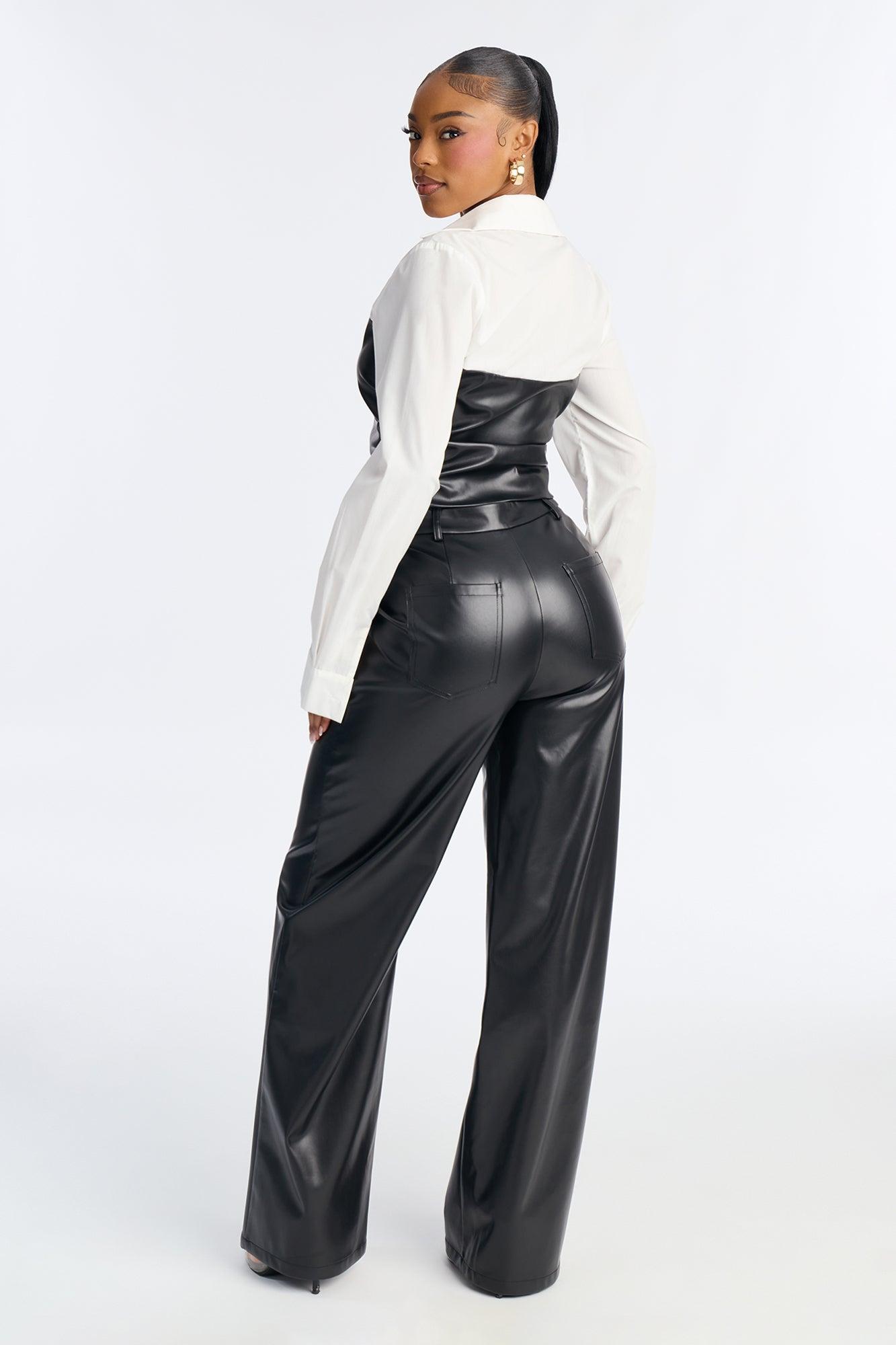Available In Black. 2 Piece Ensemble Long Sleeve Top And Pant Set Stretch Pockets Wide Leg 33" Inseam Self: 100% Polyester with Polyurethane Coating Contrast: 65% Cotton 35% Polyester Lining: 100% Polyester Bottom: 100% Polyester with Polyurethane Coating Imported