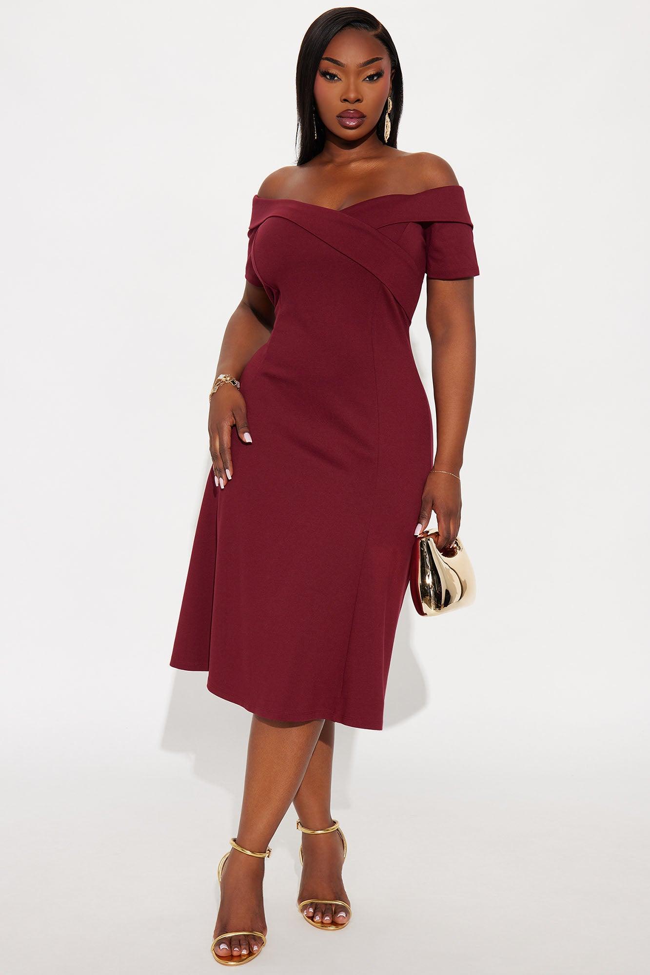 Available In Black And Wine. Ponte Midi Dress Off Shoulder Short Sleeve Back Zipper Closure Stretch Length Measured Flat = 37" Self : 62% Viscose 33% Nylon 5% Spandex Imported California Proposition 65WARNING: Cancer and Reproductive Harm - www.P65Warnings.ca.gov.