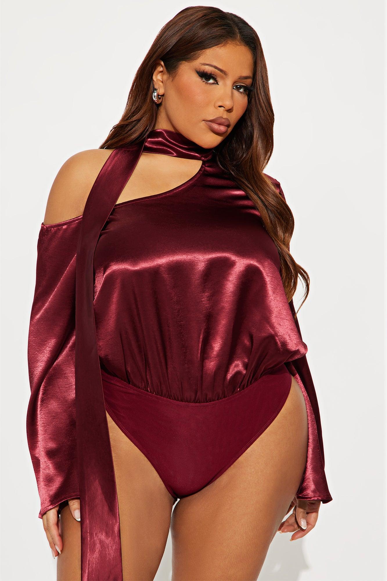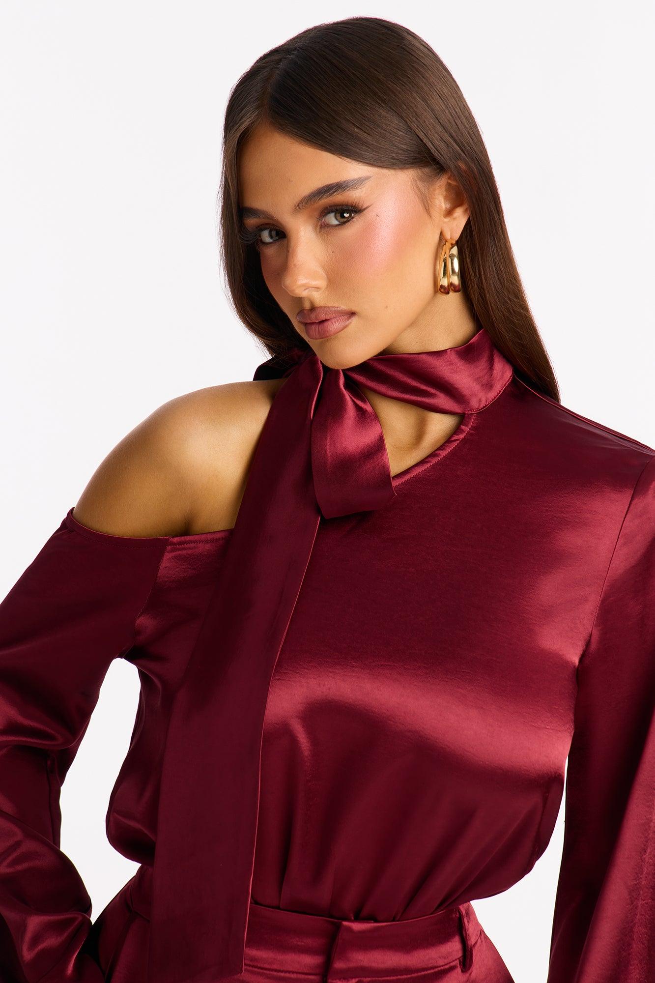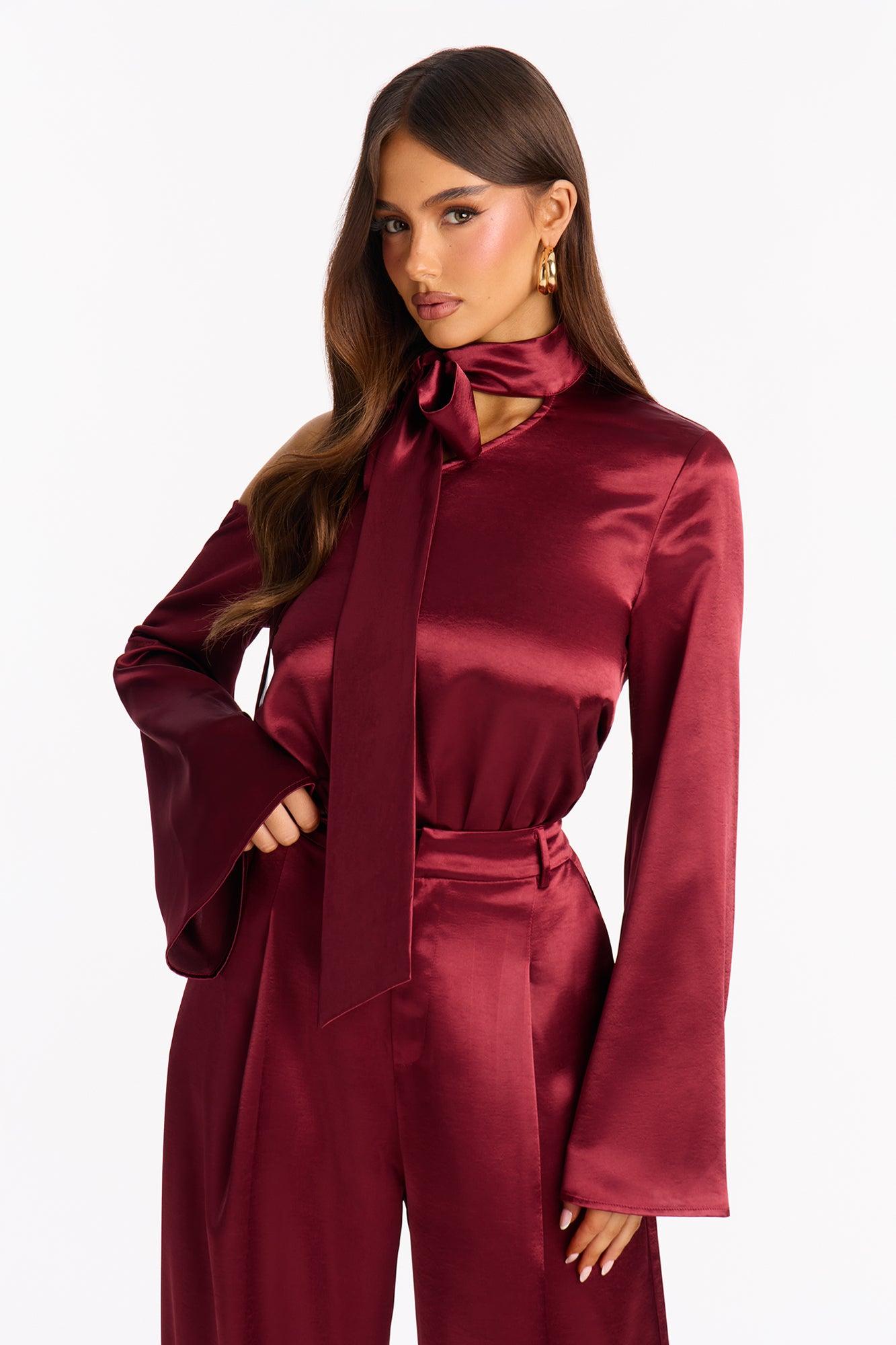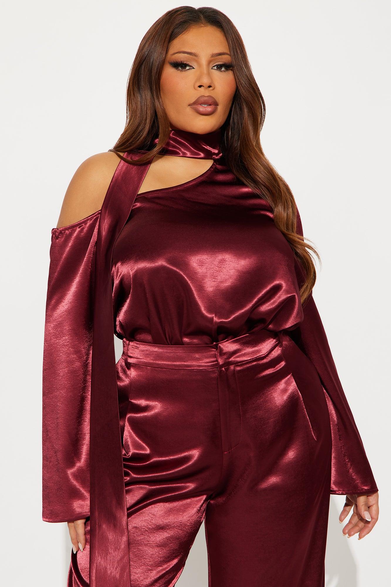 Adeline Satin Tie Neck Bodysuit Pant Set - Burgundy Female