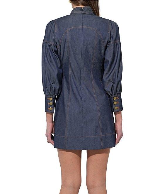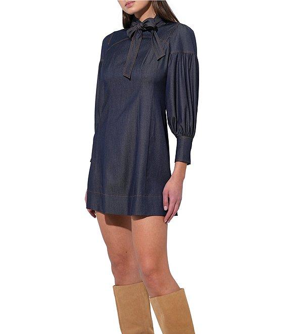 From Adelyn Rae, the Lilith dress features: Denim fabrication Sheath silhouette Mock tie neckline Long sleeves Self neck tie Zip back closure Approx. 25" length Polyester/Rayon/Spandex Hand wash cold Imported.
