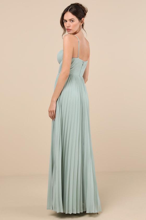 Stroll into the party looking like the best dressed guest in the Lulus Admirable Elegance Sage Green Pleated Bustier Maxi Dress! Lightweight woven fabric shapes this stunning dress that has adjustable spaghetti straps and a bustier-style bodice with a sweetheart neckline, seamed padded cups, and hidden side boning. Micro-pleated texture throughout lends an elevated effect. Fitted waist tops an accordion-pleated skirt that falls to a twirl-ready maxi hem. Hidden zipper/clasp at back.