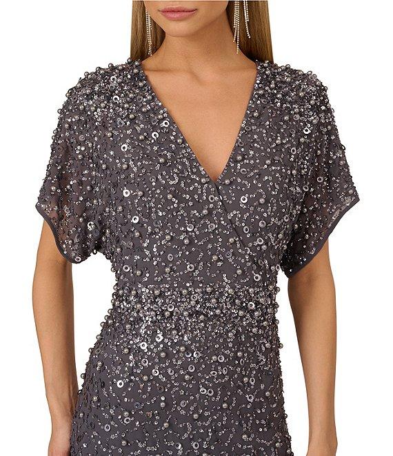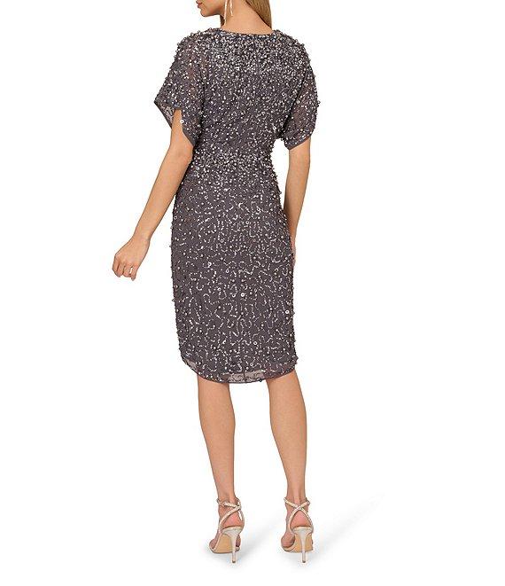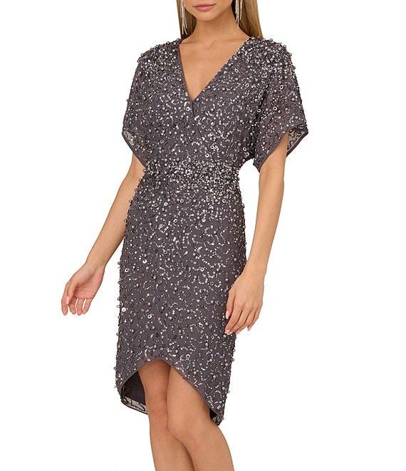 From Adrianna Papell, this dress features: Beaded mesh fabrication V-neckline Short dolman sleeves High-low hem Back zip closure Approx. 36" length Viscose/nylon Spot clean Imported.