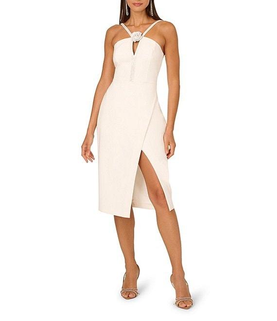 From Adrianna by Adrianna Papell, this dress features: Stretch crepe fabrication Sheath silhouette Halter neckline Sleeveless Rhine straps Front flower detail Front slit Fully lined Straight hemline Center back zip closure Approx. 44" length Polyester/elastane Dry clean Imported.