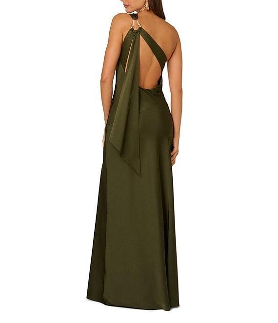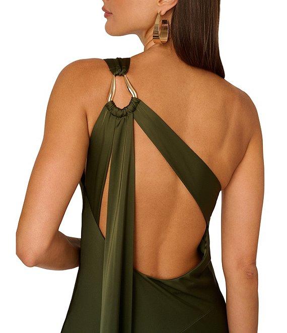 From Adrianna by Adrianna Papell, this dress features: Stretch satin fabrication Sheath silhouette One-shoulder neckline Sleeveless Draped open back Pleats detail High slit Fully lined Straight hemline Side zip closure Approx. 62" length Polyester/elastane Dry clean Imported.