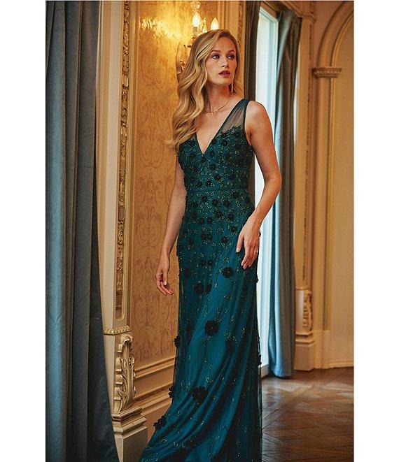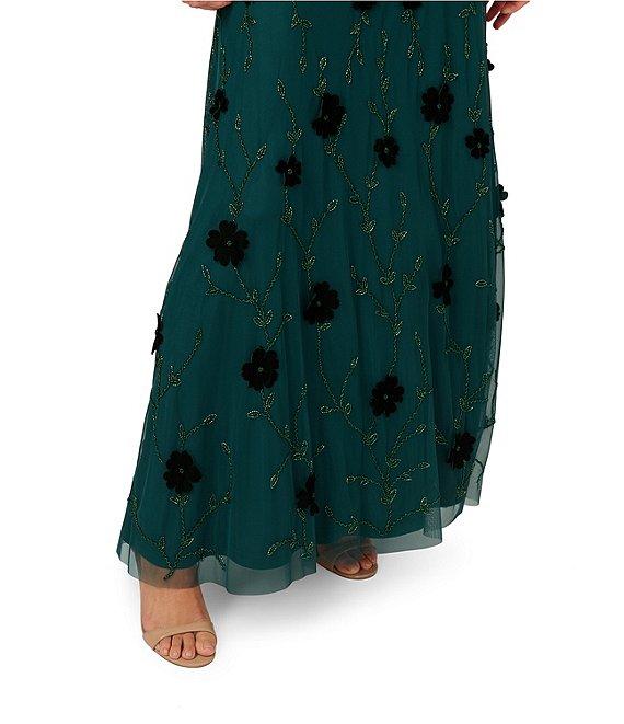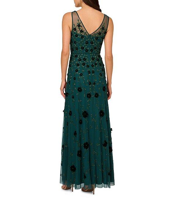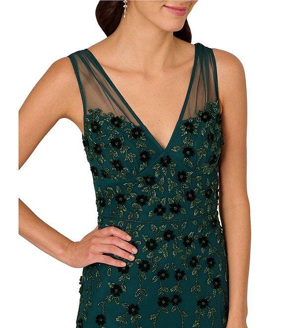 Adrianna Papell Beaded 3D Floral Mesh V-Neck Sleeveless Gown