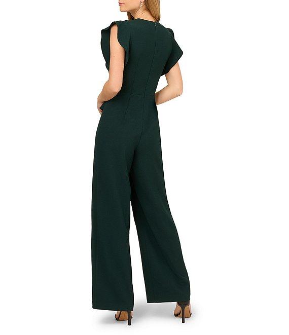 From Adrianna Papell, this jumpsuit features: Crepe fabrication Surplice v-neckline Flutter cap sleeves Overlay jumpsuit silhouette Lined Gathered waist Center back zipper closure Approx. 33" in length from inseam Polyester/elastane Machine wash Imported.