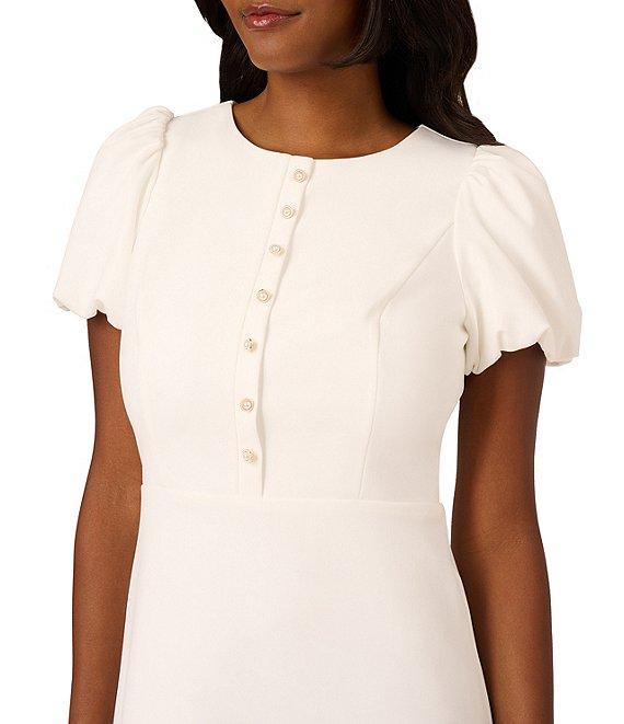 From Adrianna Papell, this dress features: Crepe fabrication Sheath silhouette Crew neckline Short puff sleeves Quarter button front Zip back closure Approx. 36" length Polyester/elastane Dry clean Imported.