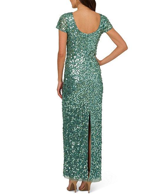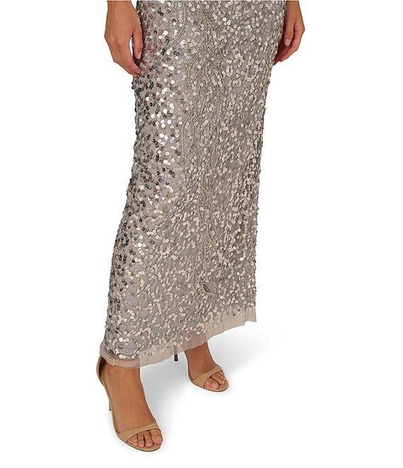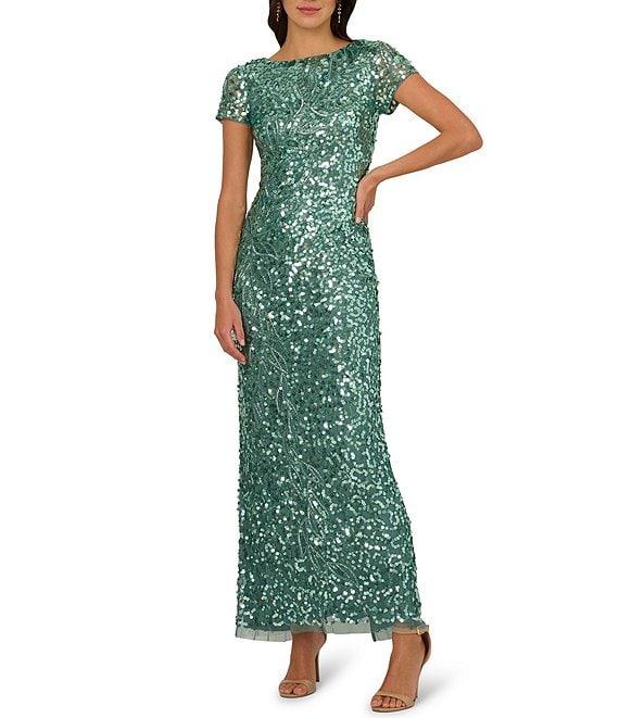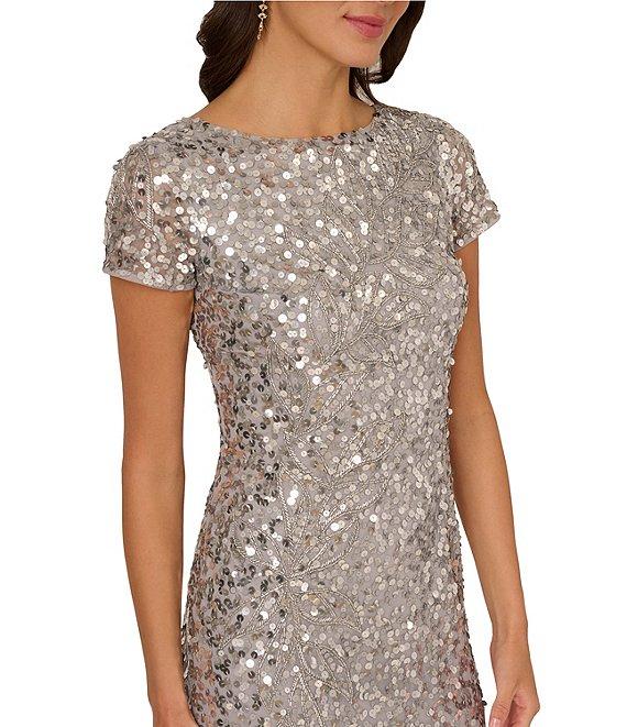 Adrianna Papell Crew Neck Short Sleeve Beaded Sequin Mesh Column Gown