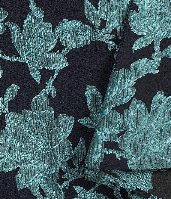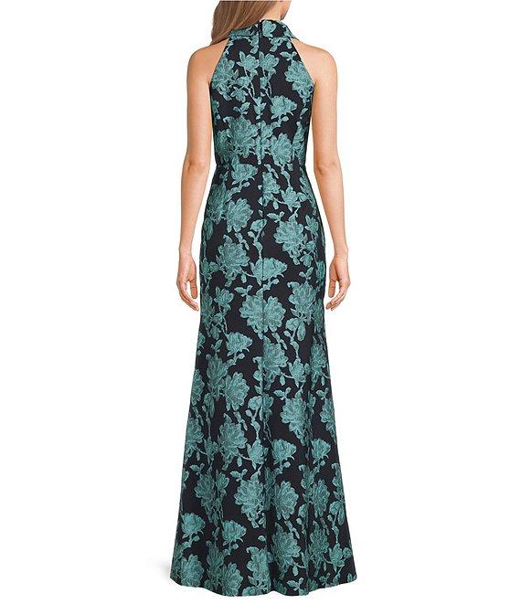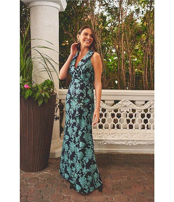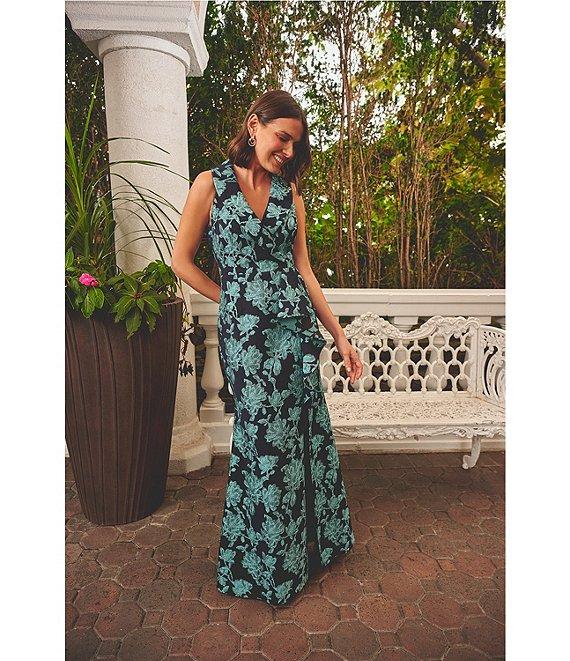 Adrianna Papell Floral Print Jacquard Tuxedo V-Neck Sleeveless Gown