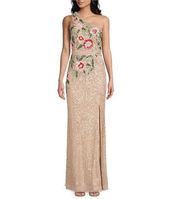 Adrianna Papell Floral Sequin Beaded Mesh One Shoulder Sleeveless Mermaid Gown