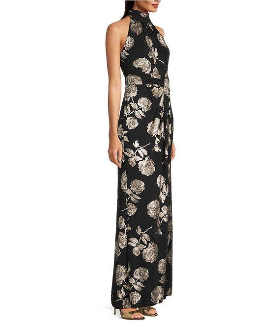 From Adrianna Papell, this dress features: Novelty knit fabrication Halter neckline Sleeveless Metallic floral print Gathered front Lined Center back zipper closure Approx. 62" in length from high point shoulder Polyester/elastane/metallic Spot clean Imported.