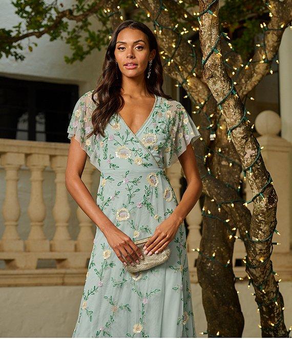 Adrianna Papell Petite Size V-Neck Flutter Sleeve Floral Beaded Mesh Hi-Lo Gown