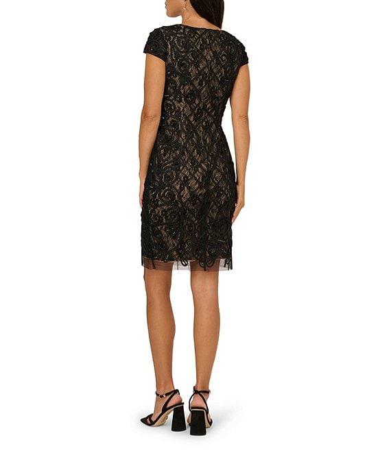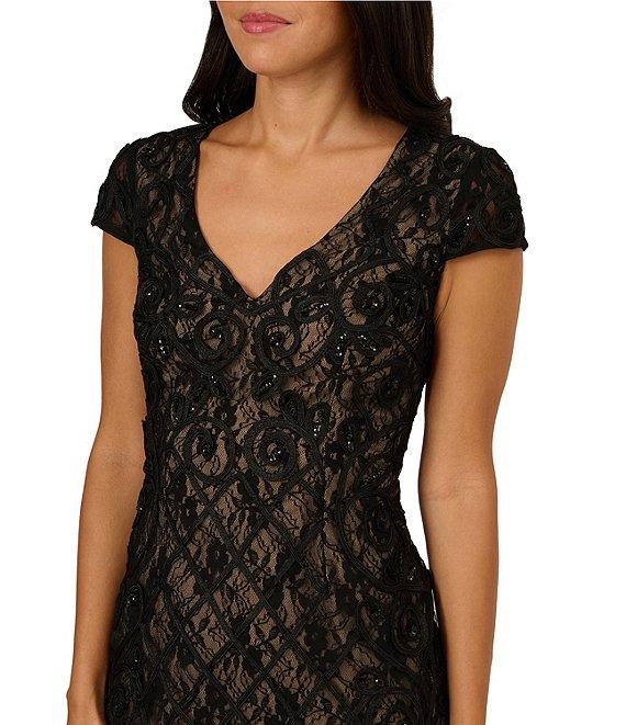 From Adrianna Papell, this dress features: Beaded mesh fabrication V-neckline Cap sleeve Soutache bead sheath silhouette Lined Center back zipper closure Polyester Spot clean Imported.