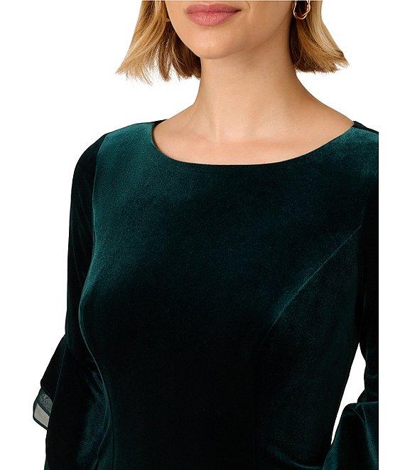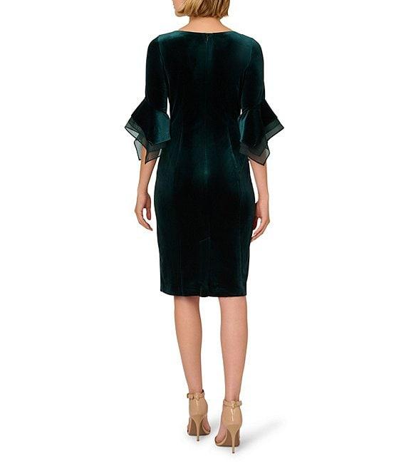 From Adrianna Papell, this dress features: all over stretch velvet fabrication Sheath silhouette boat neckline 3/4 tiered bell sleeves fully lined center zip back closure Approx. 43" in length from shoulder to hem polyester/elastane dry clean Imported.